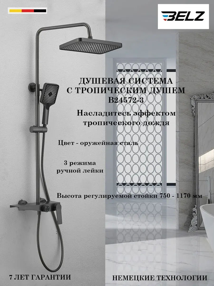 Душевая система B24572-3 в черном цвете от BELZ представляет собой комфортное и стильное решение для вашей ванной комнаты. Эта система оснащена тропическим душевым головным устройством, обеспечивающим мощный и равномерный поток воды, создавая ощущение тропического ливня. Матовое покрытие добавляет изделию элегантности и легкость в уходе. Шланги и штанги изготовлены из качественной латуни и abs-пластика, что гарантирует долговечность и надежность. Управление системой механическое, что обеспечивает удобство использования. С длиной шланга 150 см и штанги 117 см, система B24572-3 от BELZ подходит для различных размеров ванных комнат. Включает в себя 3 режима работы, позволяя выбирать наиболее подходящий для вашего настроения. Несмотря на отсутствие мыльницы, этот набор является идеальным выбором для тех, кто ценит качество и стиль. Имеется официальный выездной сервис по всей России, гарантия от производителя 5 лет на корпус и 1 год на комплектующие.
