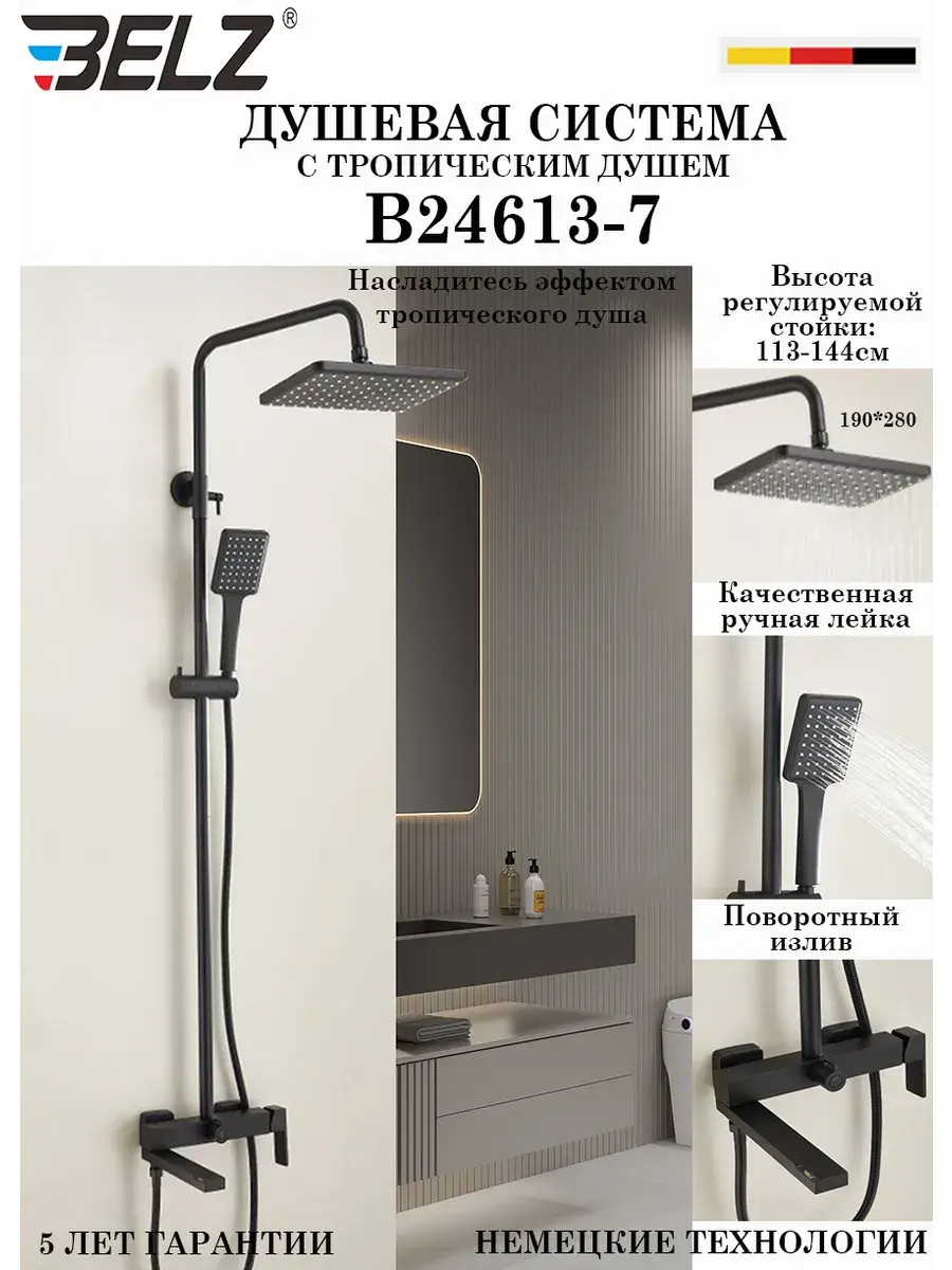 Душевая система B24613-7 в черном цвете от BELZ представляет собой комфортное и стильное решение для вашей ванной комнаты. Эта система оснащена тропическим душевым головным устройством, обеспечивающим мощный и равномерный поток воды, создавая ощущение тропического ливня. Матовое покрытие добавляет изделию элегантности и легкость в уходе. Шланги и штанги изготовлены из качественной латуни и abs-пластика, что гарантирует долговечность и надежность. Управление системой механическое, что обеспечивает удобство использования. С длиной шланга 150 см и штанги 125 см, система B24613-7 от BELZ подходит для различных размеров ванных комнат. Включает в себя 3 режима работы, позволяя выбирать наиболее подходящий для вашего настроения. Несмотря на отсутствие мыльницы, этот набор является идеальным выбором для тех, кто ценит качество и стиль. Имеется официальный выездной сервис по всей России, гарантия от производителя 5 лет на корпус и 1 год на комплектующие.