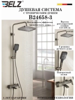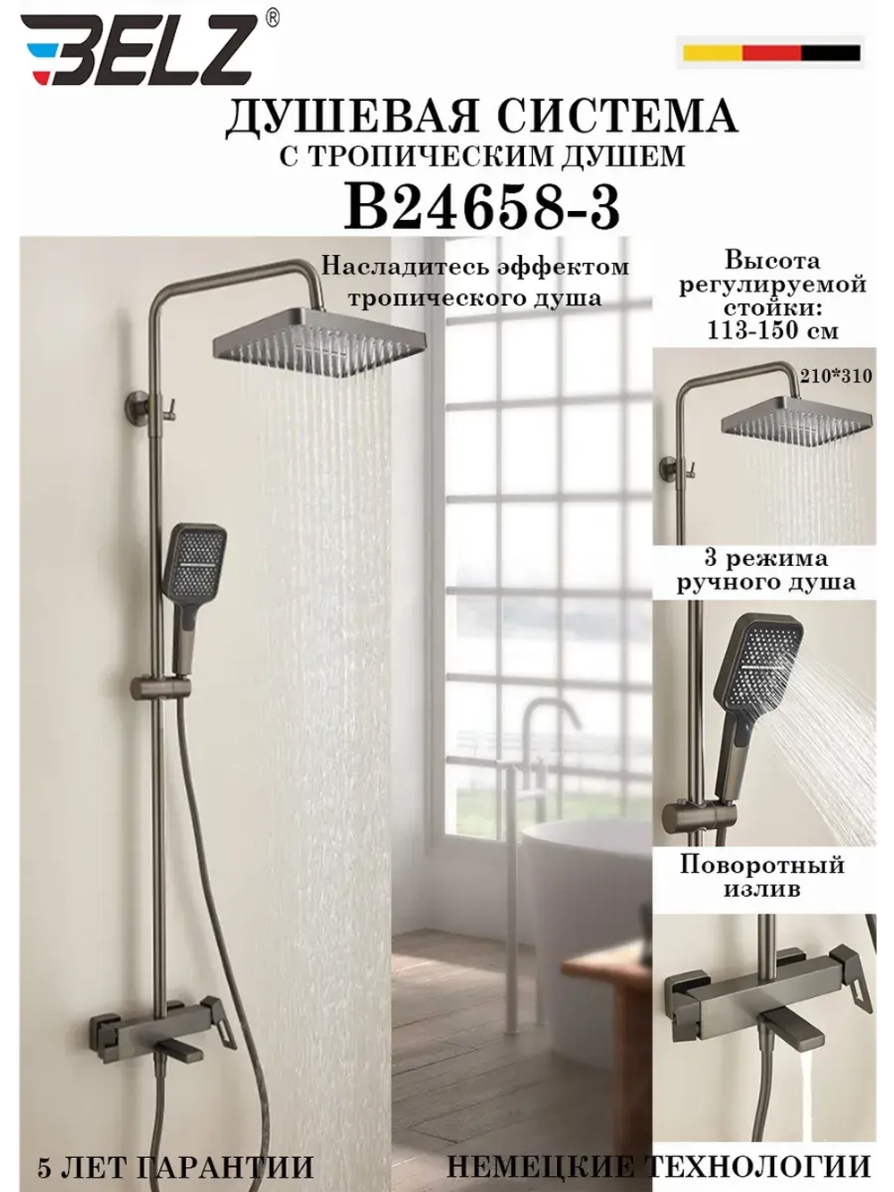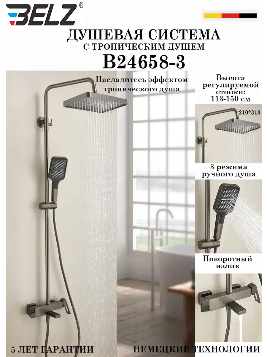 Душевая система B24658-3 в цвете оружейная сталь от BELZ представляет собой комфортное и стильное решение для вашей ванной комнаты. Эта система оснащена тропическим душевым головным устройством, обеспечивающим мощный и равномерный поток воды, создавая ощущение тропического ливня. Матовое покрытие добавляет изделию элегантности и легкость в уходе. Шланги и штанги изготовлены из качественной латуни и abs-пластика, что гарантирует долговечность и надежность. Управление системой механическое, что обеспечивает удобство использования. С длиной шланга 150 см и штанги 150 см, система B24658-3 от BELZ подходит для различных размеров ванных комнат. Включает в себя 3 режима работы, позволяя выбирать наиболее подходящий для вашего настроения. Несмотря на отсутствие мыльницы, этот набор является идеальным выбором для тех, кто ценит качество и стиль. Имеется официальный выездной сервис по всей России, гарантия от производителя 5 лет на корпус и 1 год на комплектующие.