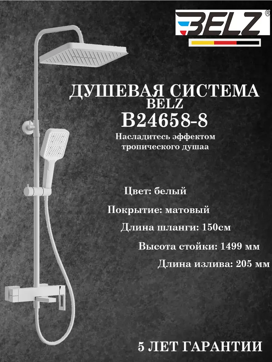 Душевая система B24658-8 в белом цвете от BELZ представляет собой комфортное и стильное решение для вашей ванной комнаты. Эта система оснащена тропическим душевым головным устройством, обеспечивающим мощный и равномерный поток воды, создавая ощущение тропического ливня. Матовое покрытие добавляет изделию элегантности и легкость в уходе. Шланги и штанги изготовлены из качественной латуни и abs-пластика, что гарантирует долговечность и надежность. Управление системой механическое, что обеспечивает удобство использования. С длиной шланга 150 см и штанги 150 см, система B24658-8 от BELZ подходит для различных размеров ванных комнат. Включает в себя 3 режима работы, позволяя выбирать наиболее подходящий для вашего настроения. Несмотря на отсутствие мыльницы, этот набор является идеальным выбором для тех, кто ценит качество и стиль. Имеется официальный выездной сервис по всей России, гарантия от производителя 5 лет на корпус и 1 год на комплектующие.