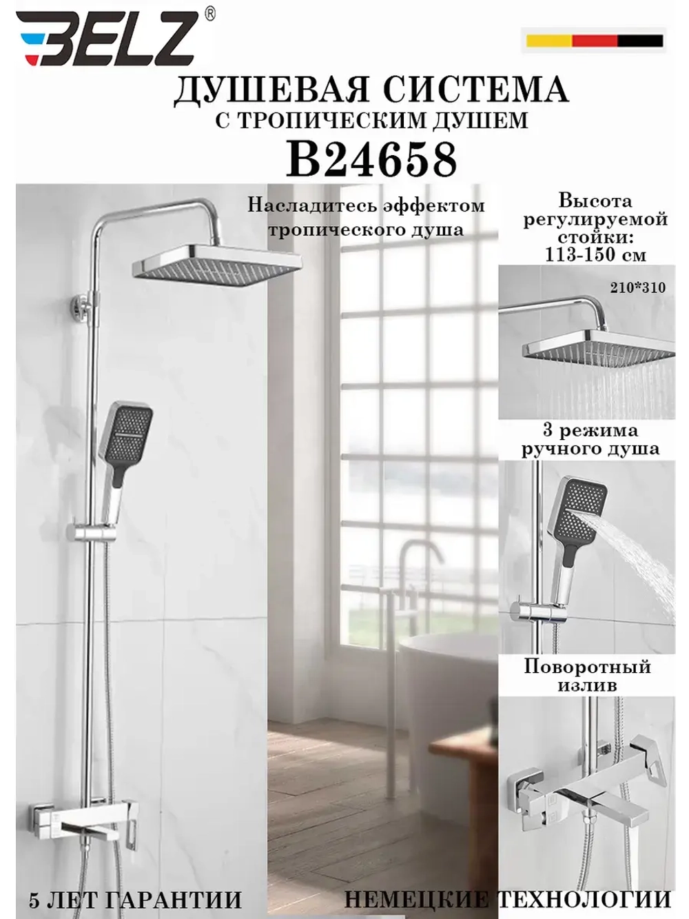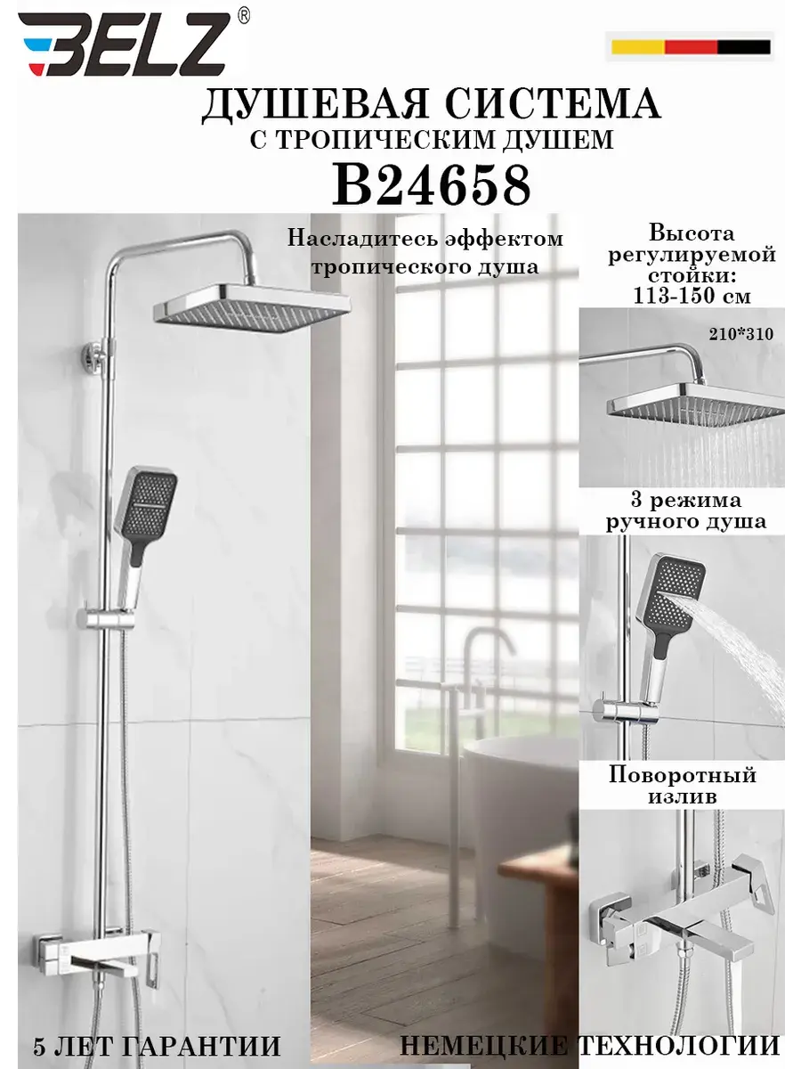 Душевая система B24658 от BELZ представляет собой комфортное и стильное решение для вашей ванной комнаты. Эта система оснащена тропическим душевым головным устройством, обеспечивающим мощный и равномерный поток воды, создавая ощущение тропического ливня. Хромированное покрытие добавляет изделию элегантности и легкость в уходе. Шланги и штанги изготовлены из качественной латуни и abs-пластика, что гарантирует долговечность и надежность. Управление системой механическое, что обеспечивает удобство использования. С длиной шланга 150 см и штанги 150 см, система B24658 от BELZ подходит для различных размеров ванных комнат. Включает в себя 3 режима работы, позволяя выбирать наиболее подходящий для вашего настроения. Несмотря на отсутствие мыльницы, этот набор является идеальным выбором для тех, кто ценит качество и стиль. Имеется официальный выездной сервис по всей России, гарантия от производителя 5 лет на корпус и 1 год на комплектующие.