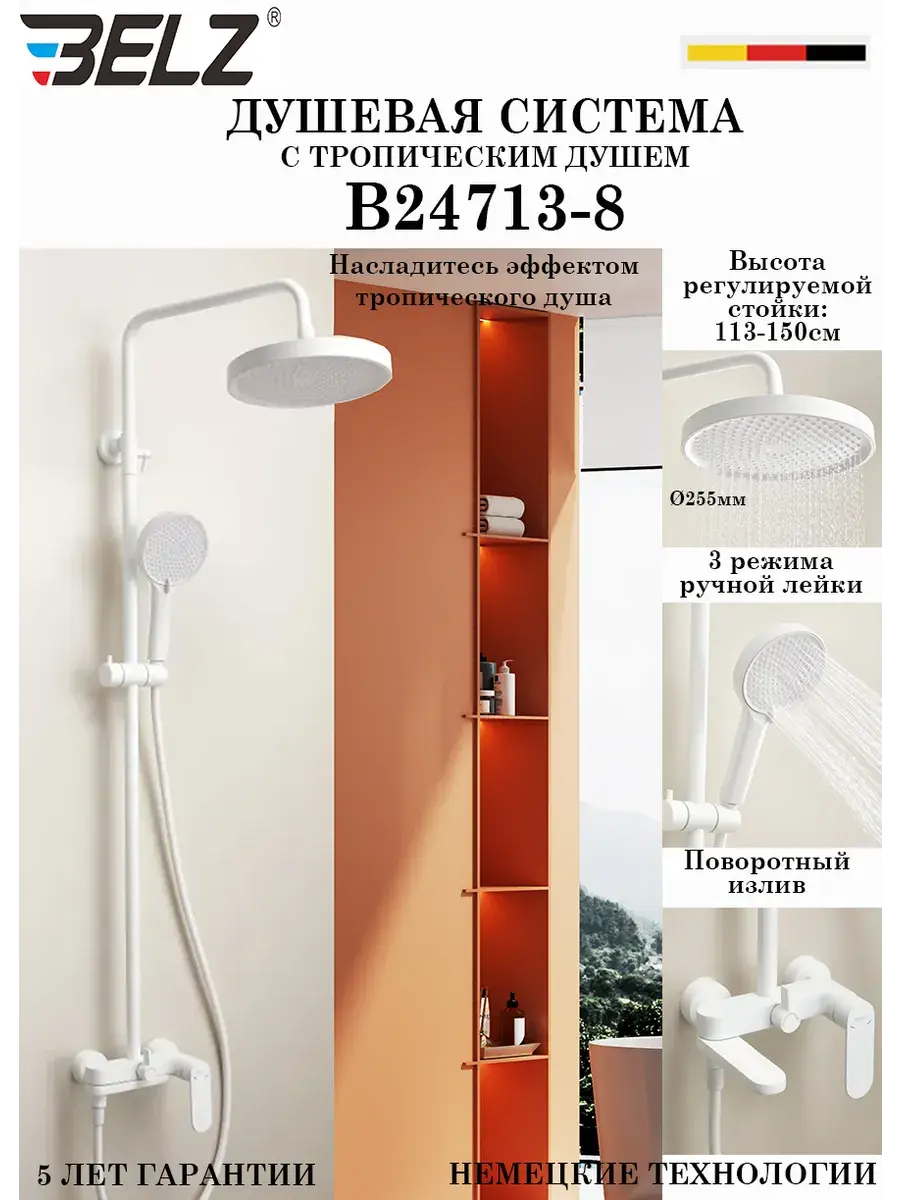 Душевая система B24713-8 в белом цвете от BELZ представляет собой комфортное и стильное решение для вашей ванной комнаты. Эта система оснащена тропическим душевым головным устройством, обеспечивающим мощный и равномерный поток воды, создавая ощущение тропического ливня. Матовое покрытие добавляет изделию элегантности и легкость в уходе. Шланги и штанги изготовлены из качественной латуни и abs-пластика, что гарантирует долговечность и надежность. Управление системой механическое, что обеспечивает удобство использования. С длиной шланга 150 см и штанги 150 см, система B24713-8 от BELZ подходит для различных размеров ванных комнат. Включает в себя 3 режима работы, позволяя выбирать наиболее подходящий для вашего настроения. Несмотря на отсутствие мыльницы, этот набор является идеальным выбором для тех, кто ценит качество и стиль. Имеется официальный выездной сервис по всей России, гарантия от производителя 5 лет на корпус и 1 год на комплектующие.