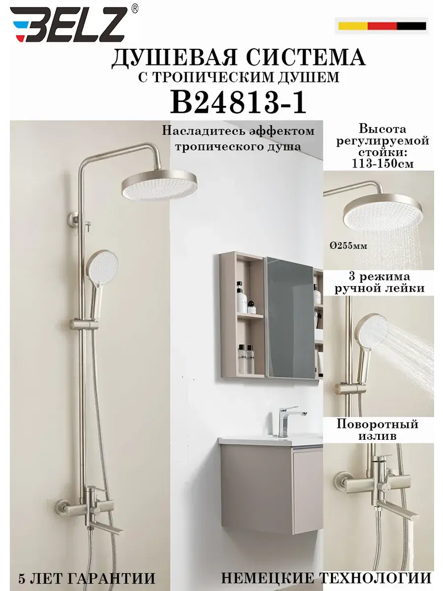 Душевая система B24813-1 в сатиновом цвете от BELZ представляет собой комфортное и стильное решение для вашей ванной комнаты. Эта система оснащена тропическим душевым головным устройством, обеспечивающим мощный и равномерный поток воды, создавая ощущение тропического ливня. Матовое покрытие добавляет изделию элегантности и легкость в уходе. Шланги и штанги изготовлены из качественной латуни и abs-пластика, что гарантирует долговечность и надежность. Управление системой механическое, что обеспечивает удобство использования. С длиной шланга 150 см и штанги 150 см, система B24813-1 от BELZ подходит для различных размеров ванных комнат. Включает в себя 3 режима работы, позволяя выбирать наиболее подходящий для вашего настроения. Несмотря на отсутствие мыльницы, этот набор является идеальным выбором для тех, кто ценит качество и стиль. Имеется официальный выездной сервис по всей России, гарантия от производителя 5 лет на корпус и 1 год на комплектующие.