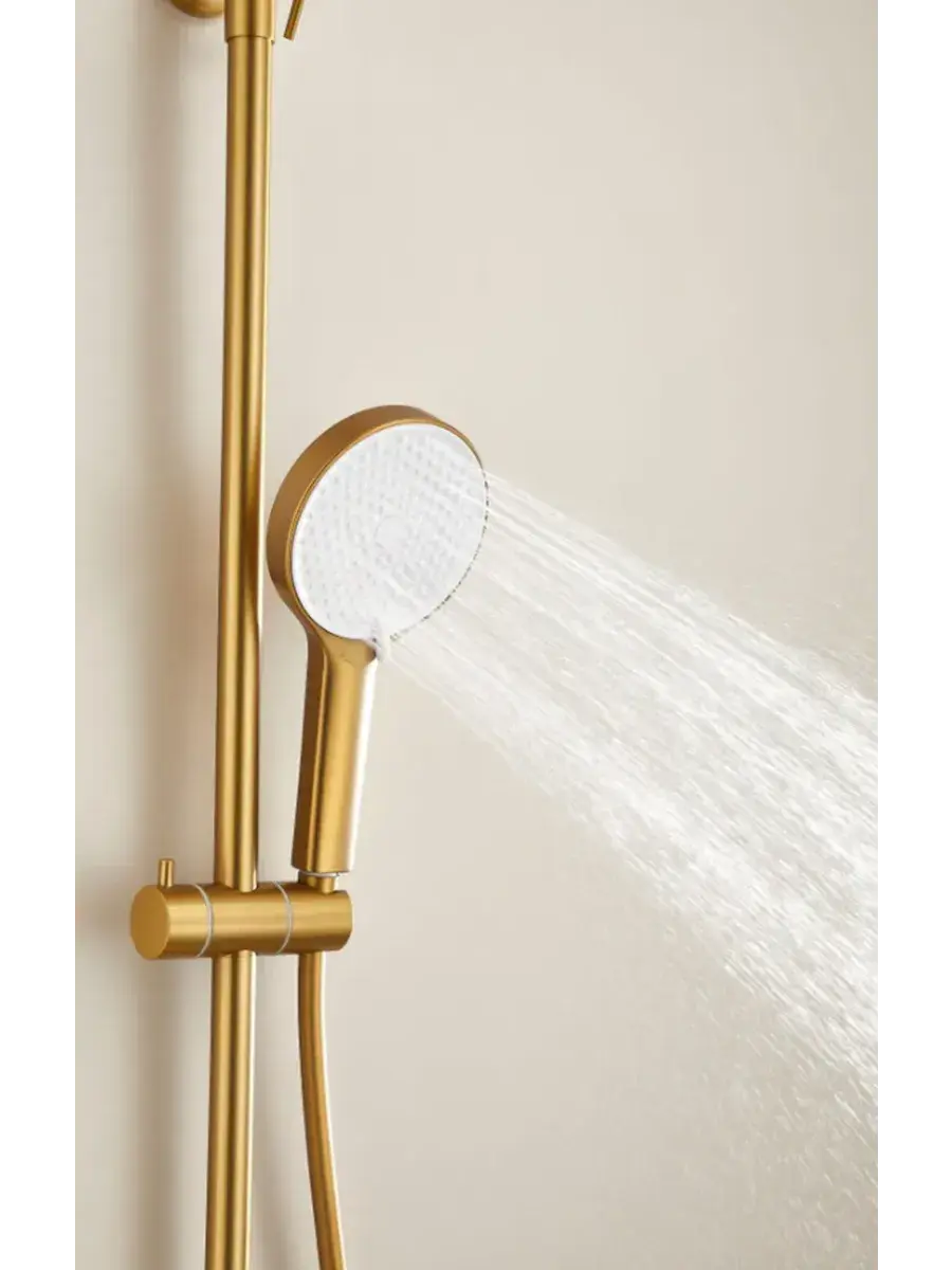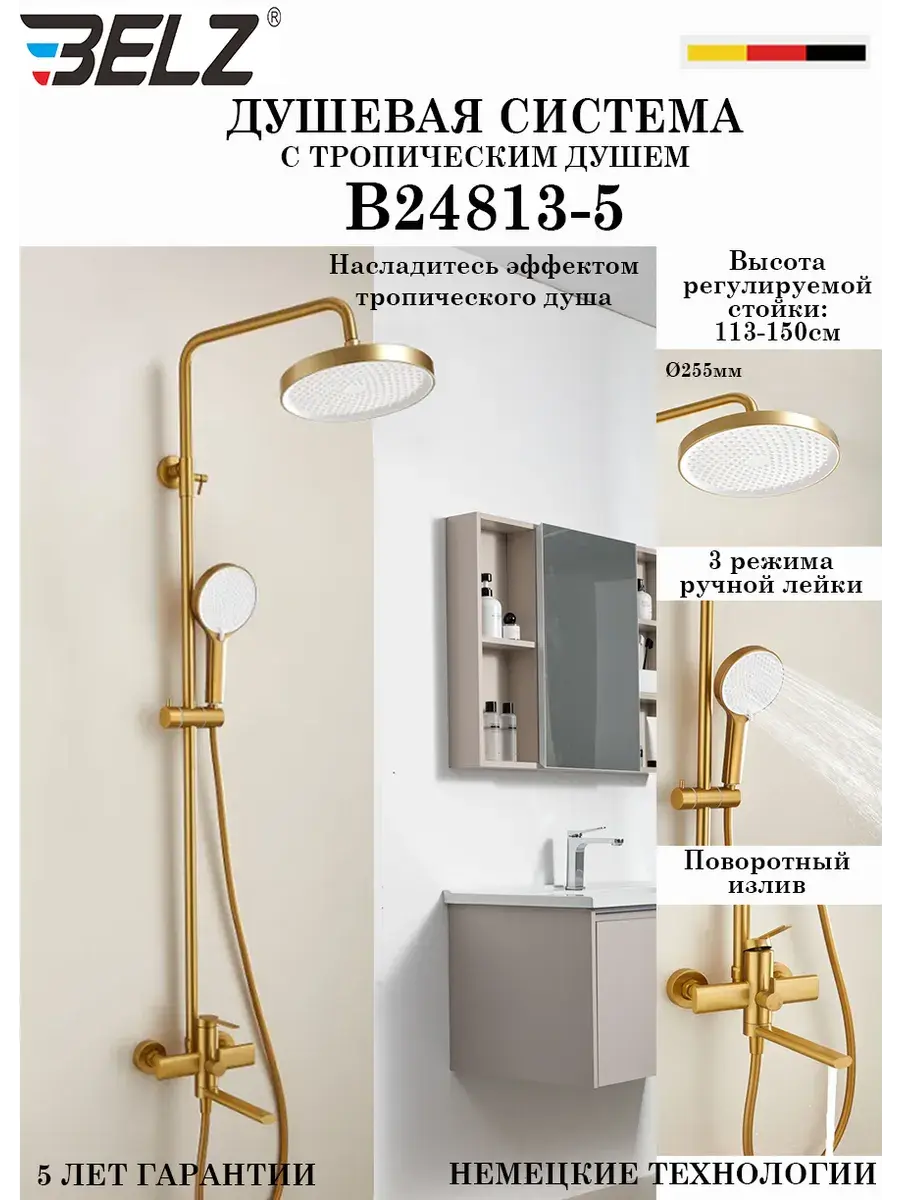 Душевая система B24813-5 в золотом цвете от BELZ представляет собой комфортное и стильное решение для вашей ванной комнаты. Эта система оснащена тропическим душевым головным устройством, обеспечивающим мощный и равномерный поток воды, создавая ощущение тропического ливня. Матовое покрытие добавляет изделию элегантности и легкость в уходе. Шланги и штанги изготовлены из качественной латуни и abs-пластика, что гарантирует долговечность и надежность. Управление системой механическое, что обеспечивает удобство использования. С длиной шланга 150 см и штанги 150 см, система B24813-5 от BELZ подходит для различных размеров ванных комнат. Включает в себя 3 режима работы, позволяя выбирать наиболее подходящий для вашего настроения. Несмотря на отсутствие мыльницы, этот набор является идеальным выбором для тех, кто ценит качество и стиль. Имеется официальный выездной сервис по всей России, гарантия от производителя 5 лет на корпус и 1 год на комплектующие.