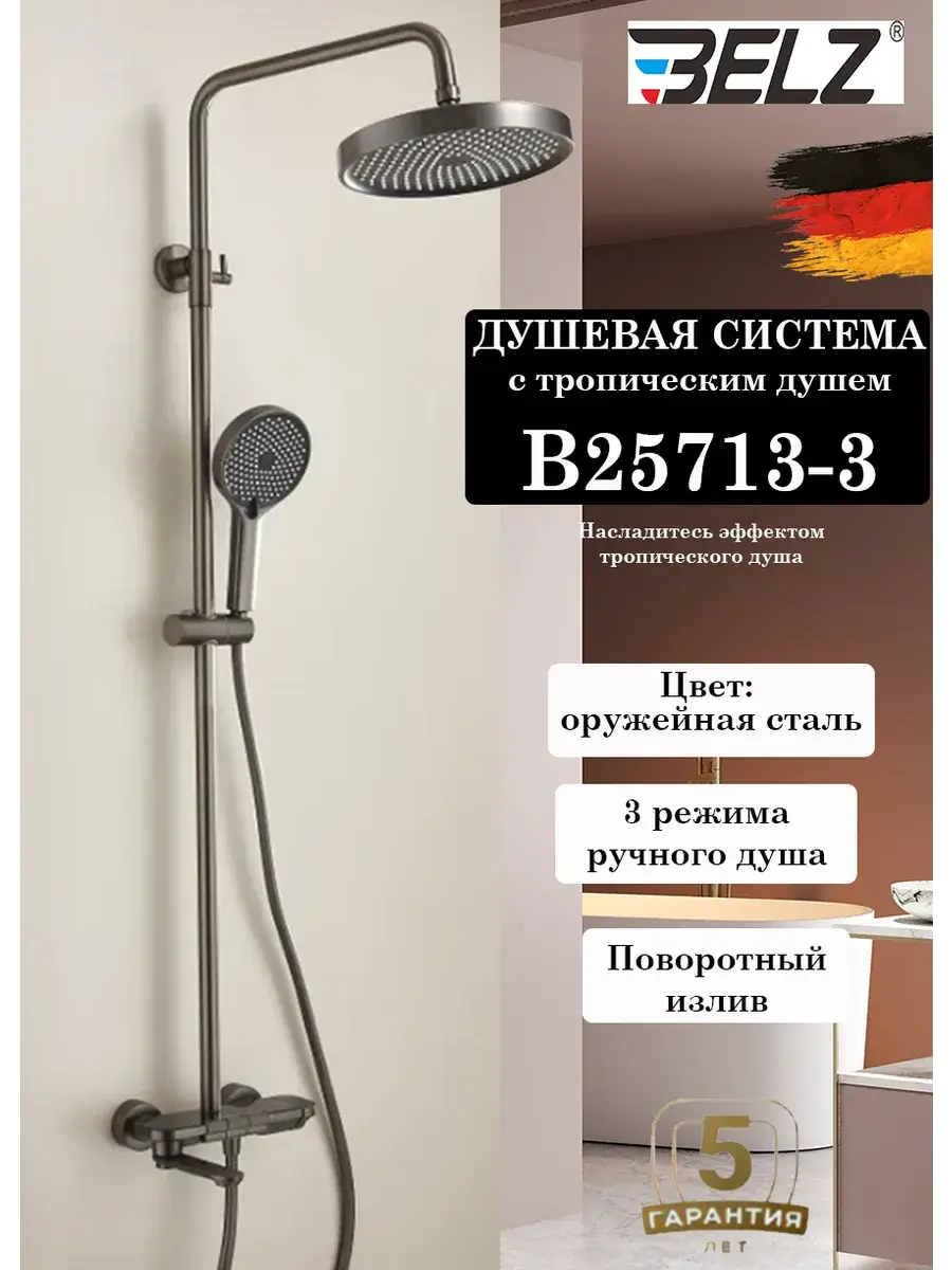 Душевая система B25713-3 в цвете оружейная сталь от BELZ представляет собой комфортное и стильное решение для вашей ванной комнаты. Эта система оснащена тропическим душевым головным устройством, обеспечивающим мощный и равномерный поток воды, создавая ощущение тропического ливня. Матовое покрытие добавляет изделию элегантности и легкость в уходе. Шланги и штанги изготовлены из качественной латуни и abs-пластика, что гарантирует долговечность и надежность. Управление системой механическое, что обеспечивает удобство использования. С длиной шланга 150 см и штанги 150 см, система B25713-3 от BELZ подходит для различных размеров ванных комнат. Включает в себя 3 режима работы, позволяя выбирать наиболее подходящий для вашего настроения. Несмотря на отсутствие мыльницы, этот набор является идеальным выбором для тех, кто ценит качество и стиль. Имеется официальный выездной сервис по всей России, гарантия от производителя 5 лет на корпус и 1 год на комплектующие.