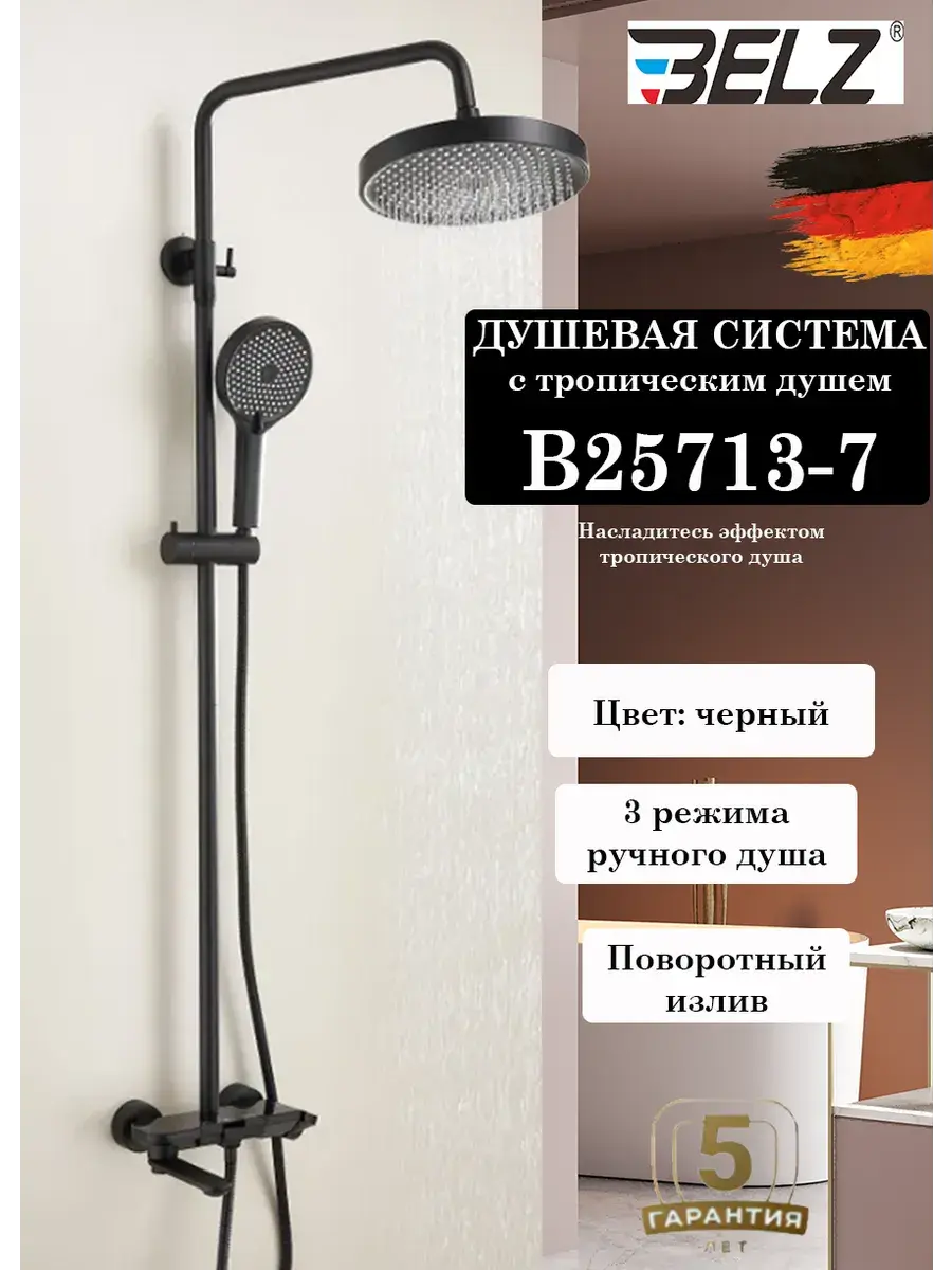 Душевая система B25713-7 в черном цвете от BELZ представляет собой комфортное и стильное решение для вашей ванной комнаты. Эта система оснащена тропическим душевым головным устройством, обеспечивающим мощный и равномерный поток воды, создавая ощущение тропического ливня. Матовое покрытие добавляет изделию элегантности и легкость в уходе. Шланги и штанги изготовлены из качественной латуни и abs-пластика, что гарантирует долговечность и надежность. Управление системой механическое, что обеспечивает удобство использования. С длиной шланга 150 см и штанги 150 см, система B25713-7 от BELZ подходит для различных размеров ванных комнат. Включает в себя 3 режима работы, позволяя выбирать наиболее подходящий для вашего настроения. Несмотря на отсутствие мыльницы, этот набор является идеальным выбором для тех, кто ценит качество и стиль. Имеется официальный выездной сервис по всей России, гарантия от производителя 5 лет на корпус и 1 год на комплектующие.