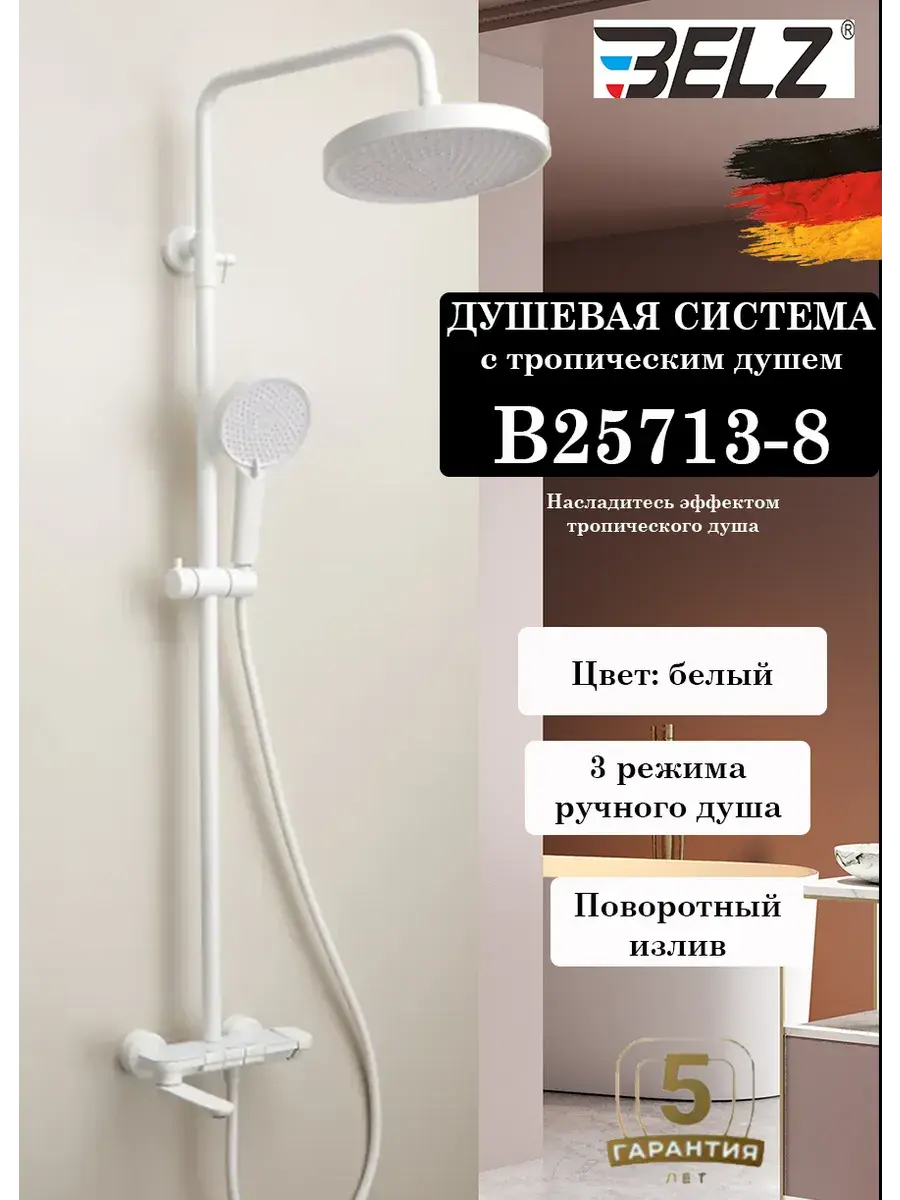 Душевая система B25713-8 в белом цвете от BELZ представляет собой комфортное и стильное решение для вашей ванной комнаты. Эта система оснащена тропическим душевым головным устройством, обеспечивающим мощный и равномерный поток воды, создавая ощущение тропического ливня. Матовое покрытие добавляет изделию элегантности и легкость в уходе. Шланги и штанги изготовлены из качественной латуни и abs-пластика, что гарантирует долговечность и надежность. Управление системой механическое, что обеспечивает удобство использования. С длиной шланга 150 см и штанги 150 см, система B25713-8 от BELZ подходит для различных размеров ванных комнат. Включает в себя 3 режима работы, позволяя выбирать наиболее подходящий для вашего настроения. Несмотря на отсутствие мыльницы, этот набор является идеальным выбором для тех, кто ценит качество и стиль. Имеется официальный выездной сервис по всей России, гарантия от производителя 5 лет на корпус и 1 год на комплектующие.
