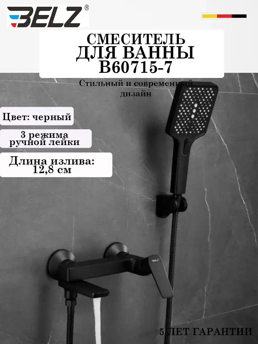 Смеситель для ванны Belz B60715-7 в черном цвете - это современное сантехническое решение с элегантным дизайном и рычажным управлением. Модель оснащена керамическим картриджем для точного контроля температуры и напора воды. Смеситель предназначен для настенного монтажа на два отверстия с жесткой подводкой 1/2". Благодаря своему современному дизайну и универсальному назначению, эта модель станет стильным и функциональным дополнением любой ванной комнаты.