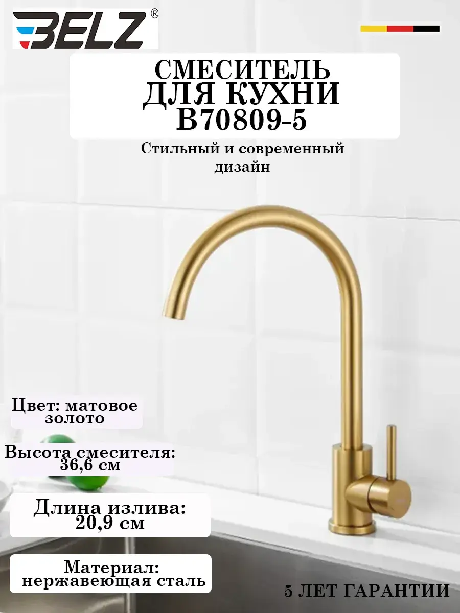 Смеситель Belz, прекрасно дополнит концепцию вашей кухни . При производстве смесителей Belz использованы комплектующие ведущих мировых компаний: Аэратор – прослужит долгие годы и позволяет значительно сократить расход воды. Керамический картридж – обладает высокой надежностью и пониженным уровнем шума. На смеситель Belz распространяется гарантия 5 лет.