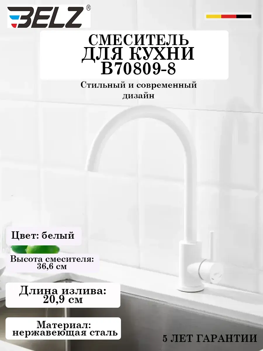 Смеситель Belz, прекрасно дополнит концепцию вашей кухни . При производстве смесителей Belz использованы комплектующие ведущих мировых компаний: Аэратор – прослужит долгие годы и позволяет значительно сократить расход воды. Керамический картридж – обладает высокой надежностью и пониженным уровнем шума. На смеситель Belz распространяется гарантия 5 лет.