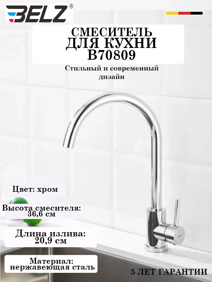 Смеситель Belz, прекрасно дополнит концепцию вашей кухни . При производстве смесителей Belz использованы комплектующие ведущих мировых компаний: Аэратор – прослужит долгие годы и позволяет значительно сократить расход воды. Керамический картридж – обладает высокой надежностью и пониженным уровнем шума. На смеситель Belz распространяется гарантия 5 лет.