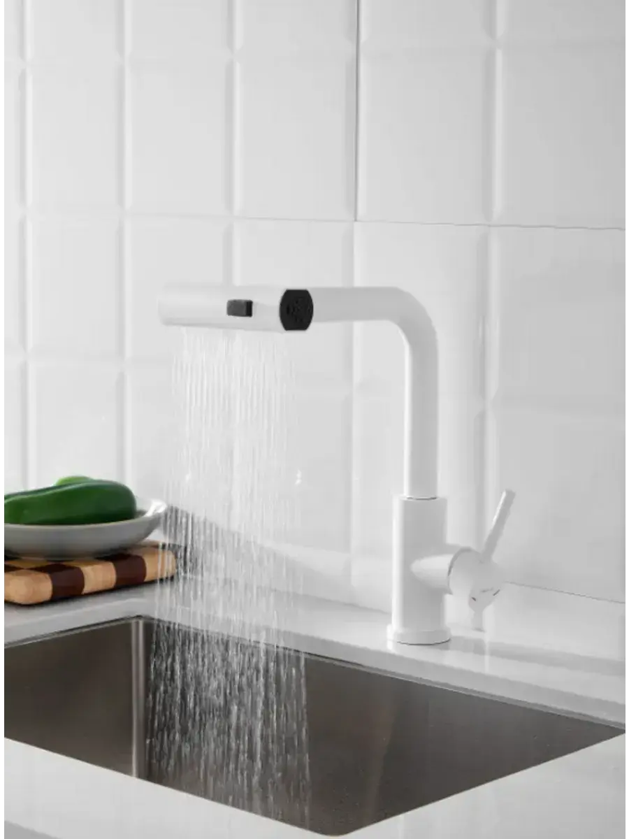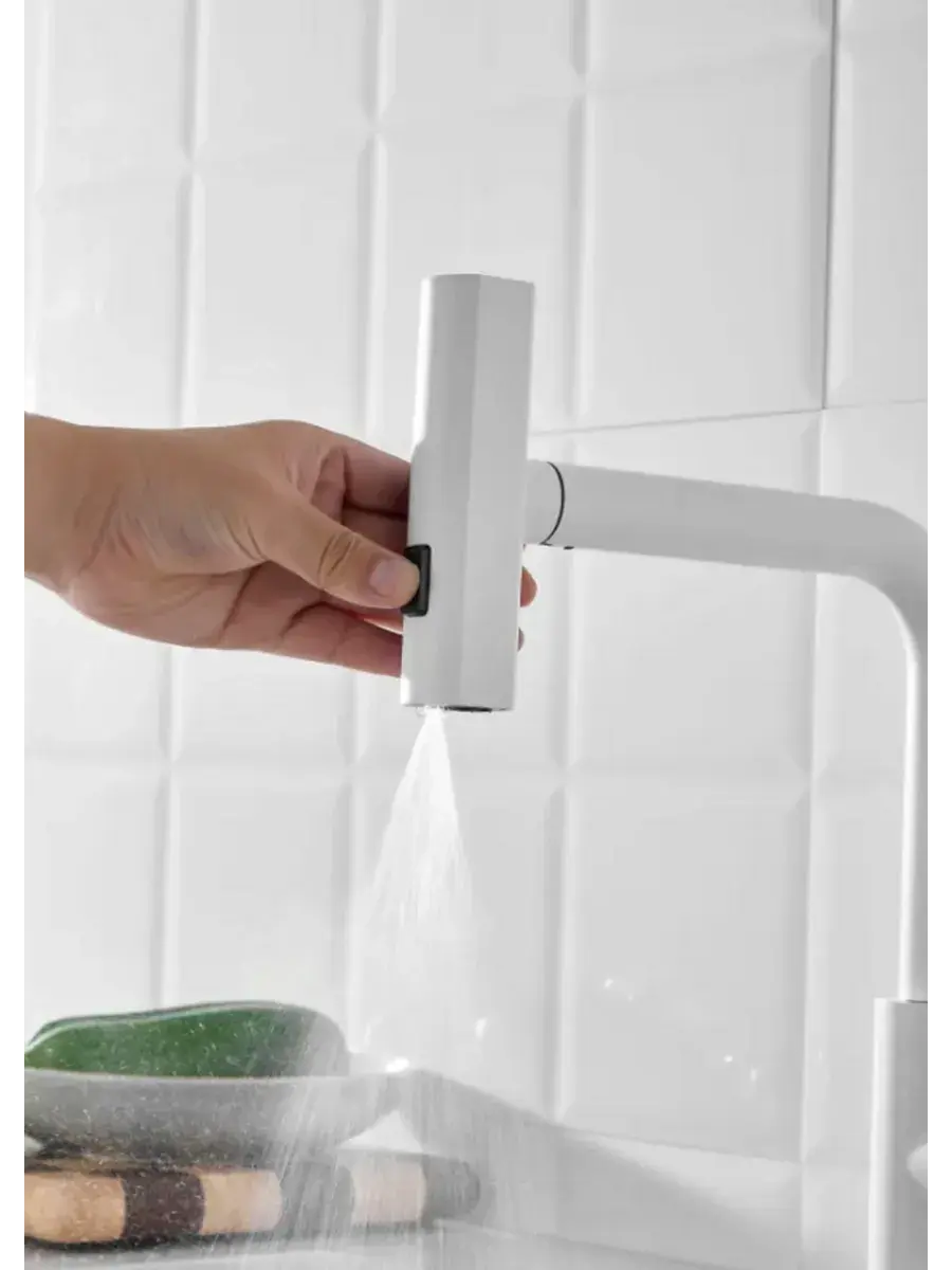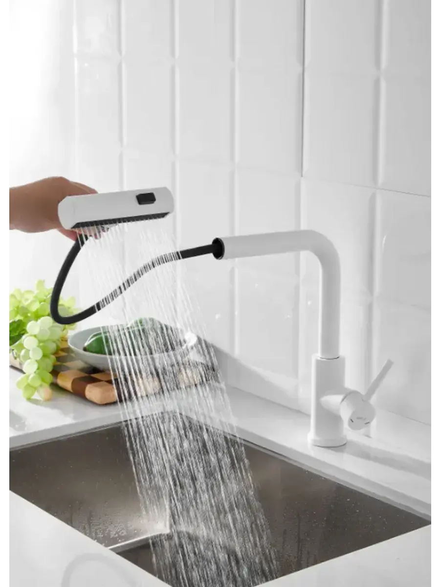 Представляем вашему вниманию смеситель для кухни с 4х-режимной выдвижной лейкой, который идеально дополнит вашу кухонную обстановку. Этот смеситель для мойки обладает стильным и современным дизайном с белым матовым покрытием, придающим кабинету чистоту и элегантность. Изготовленный из прочной нержавеющей стали, он не только долговечен, но и устойчив к коррозии и механическим повреждениям.