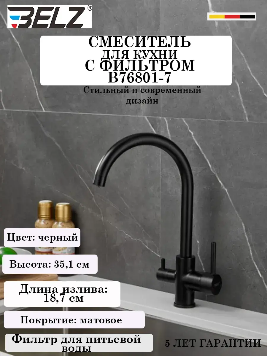 Смеситель для кухни с фильтром под питьевую воду BELZ B76801-7 имеет современный дизайн и стильный матовое покрытие, которое делает его красивым дополнением к вашей кухне. Он также легко устанавливается на раковину благодаря своему компактному размеру и легкой конструкции.