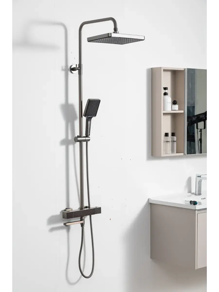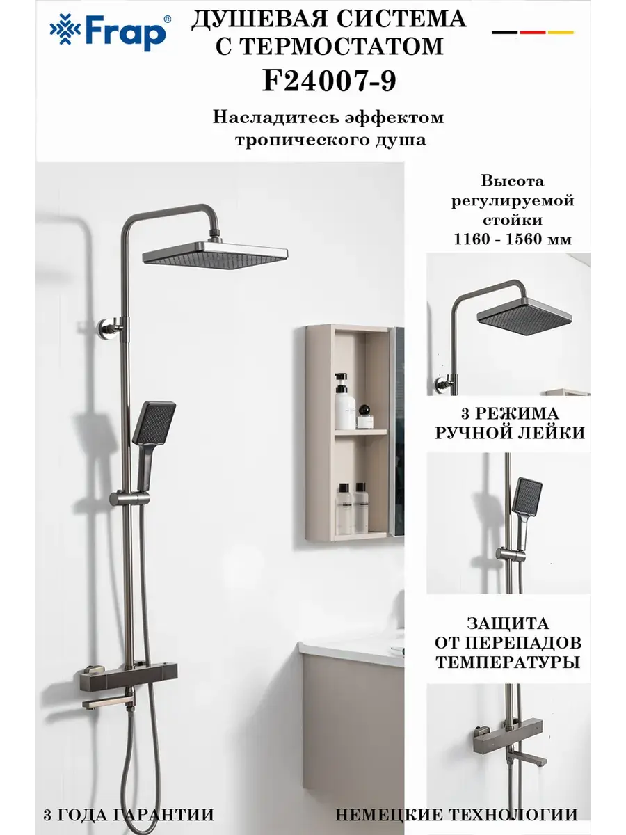 Душевая система с термостатом стойка комплект с тропическим душем для ванной комнаты латунь Frap F24007-9 - это идеальное решение для вашей ванной комнаты. Она выполнена из высококачественной латуни, что гарантирует ее долговечность и надежность. Смеситель для ванны со стойкой с душем тропический для ванны с душем оснащена смесителем с однорычажным переключением и поворотным изливом, ручной душевой лейкой и верхним тропическим душем. Благодаря испанскому керамическому картриджу SEDAL и качественному аэратору NEOPERL, расход воды будет экономичным. Высота стойки для душа регулируется в пределах 1150-1560 мм, а размеры верхнего душа, ручной лейки и душевого шланга обеспечивают комфортное использование. Гарантийный срок на корпус и покрытие составляет 3 года, а на комплектующие - 1 год. Бренд GAPPO известен своим качеством и надежностью, а хромированное покрытие придает системе элегантный и стильный вид. Тропический душ комплект с смесителем душевую стойку Frap F24007-9, вы получаете не только функциональность, но и прекрасное дополнение к интерьеру вашей ванной комнаты.