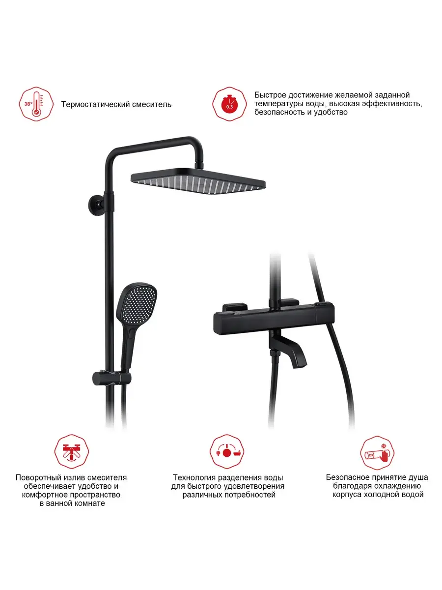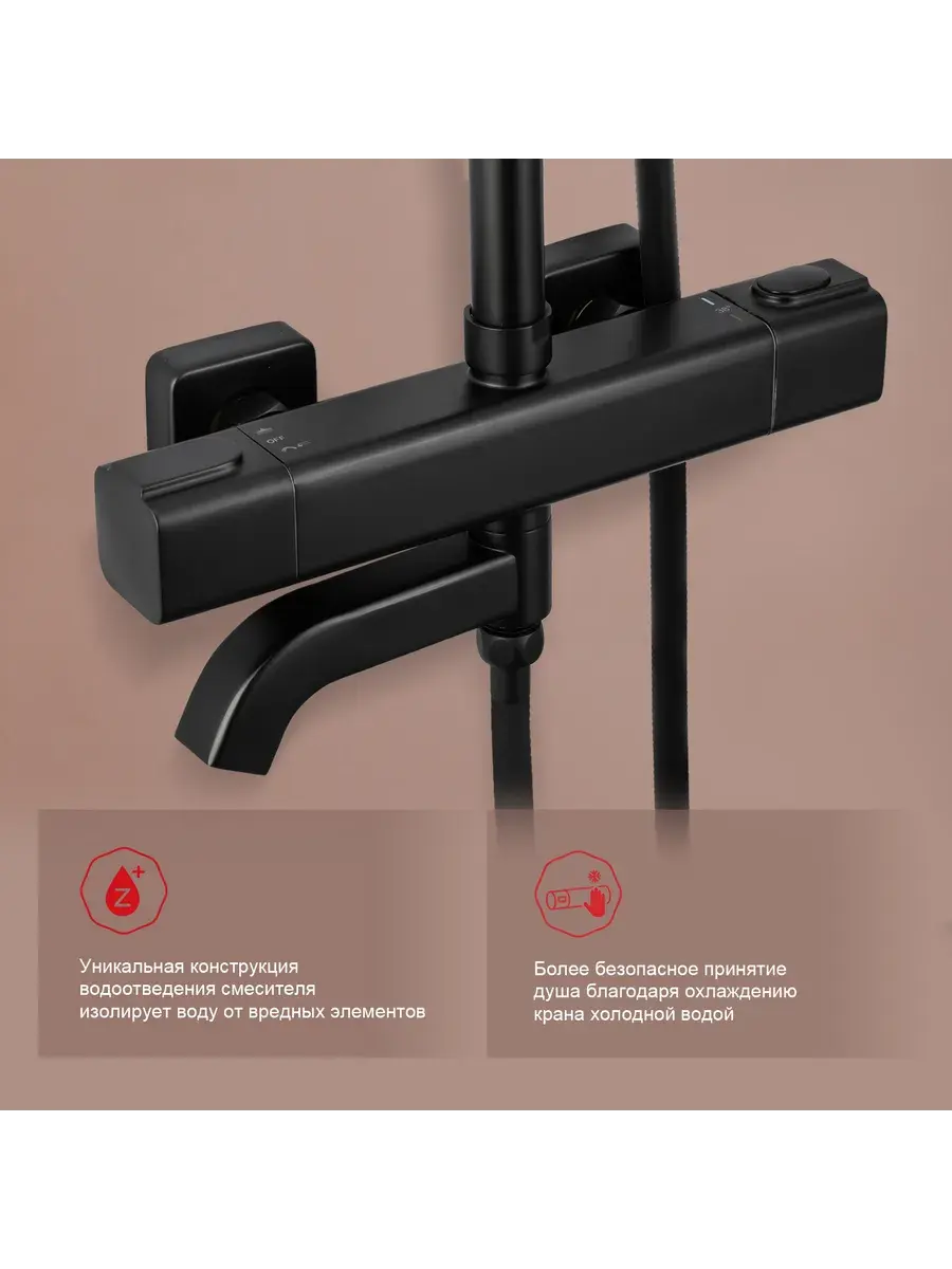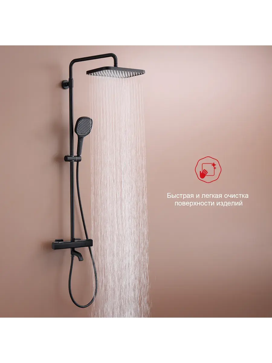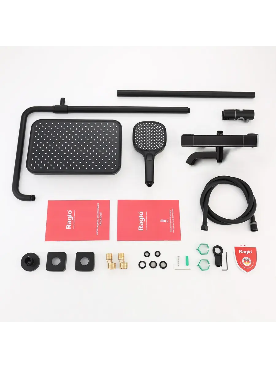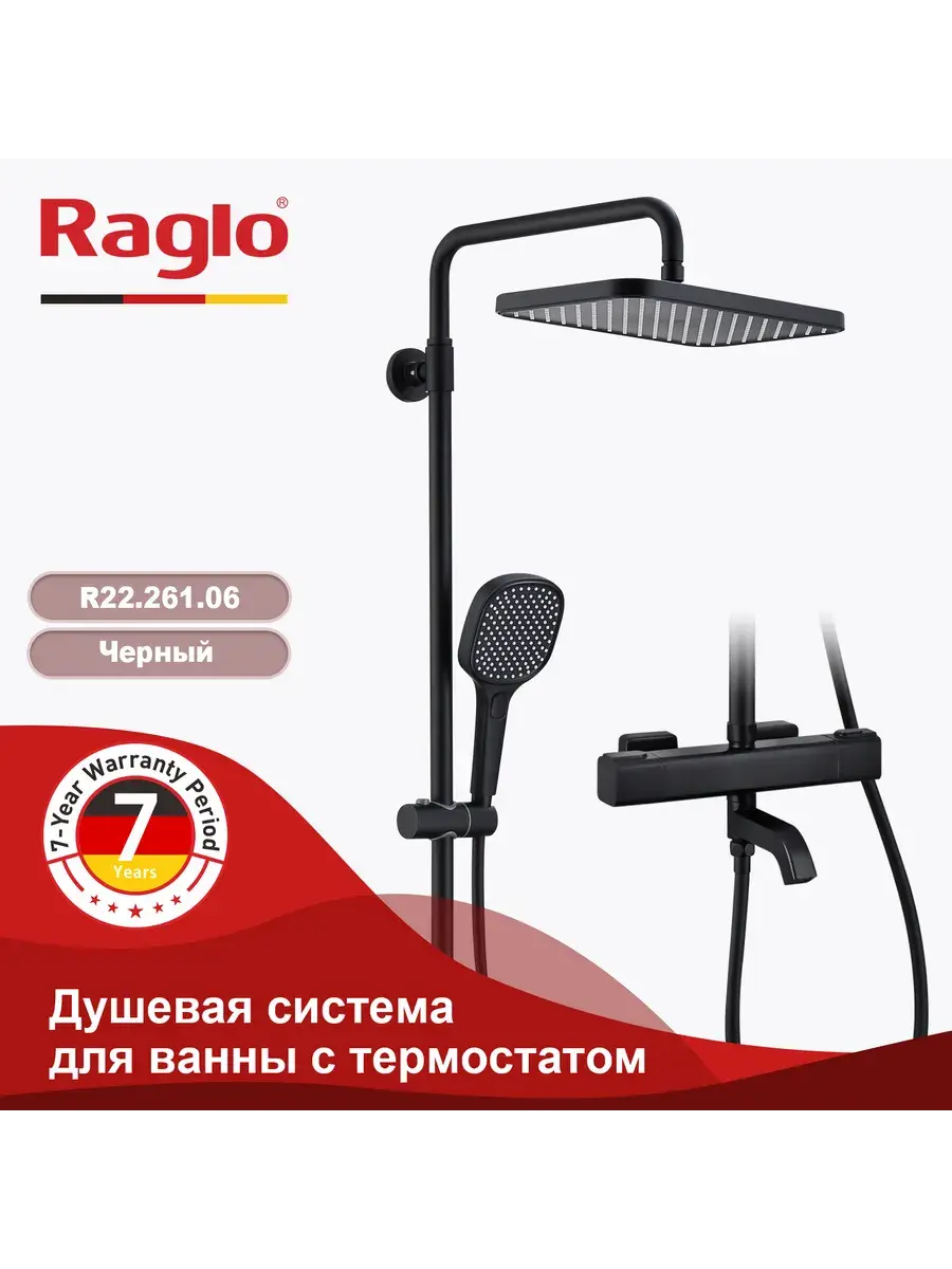Если вы задумали ремонт ванной комнаты, советуем обратить внимание на душевую систему с термостатом R22.261.06 в черном цвете. Гарнитур разработан немецким брендом по оригинальной технологии, что гарантирует высокое качество, надежность и долговечность. Наш магазин - официальный дилер Raglo в России. Мы поставляем только оригинальную продукцию и даем 5 лет гарантии на изделия. Душевая система включает в себя смеситель, тропический душ и ручную лейку. Предусмотрено 3 режима подачи воды. Задвинув металлический кран, можно переключить воду на гибкий душевой шланг со съемной ручной лейкой. После этого поворотный кран позволит переключить водный поток на тропический душ с массажным эффектом. Также плоскую лейку можно закрепить в держателе на стойке - штанге. Выдвижная телескопическая стальная палка с креплением позволяет установить верхнюю насадку на том уровне, который будет вам максимально удобен. Встроенный мгновенный терморегулятор с датчиком обеспечивает защиту от перепадов температуры и ожогов. Есть кнопка фиксации безопасной температуры. Высокочувствительный переключатель с ручным управлением позволяет настроить термостатический регулятор максимально точно, с учетом ваших потребностей. Также вы можете дополнительно приобрести в нашем магазине шланг - переходник для подключения системы. Встраиваемую систему легко закрепить на стене или стенке душевой кабины с помощью скрытого настенного крепежа в комплекте. ВНИМАНИЕ! Чтобы термостат в сантехнике работал корректно, необходимо подвести горячую воду слева, а холодную справа.