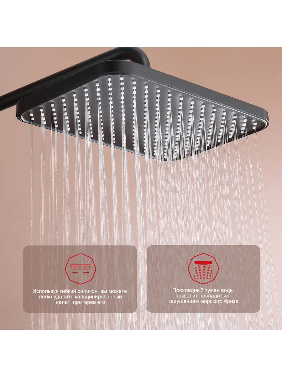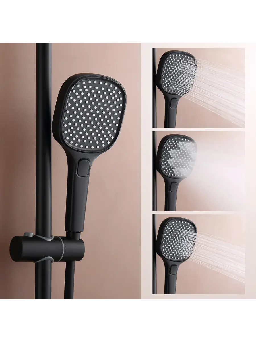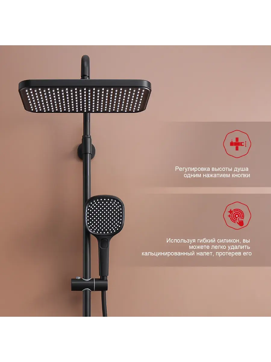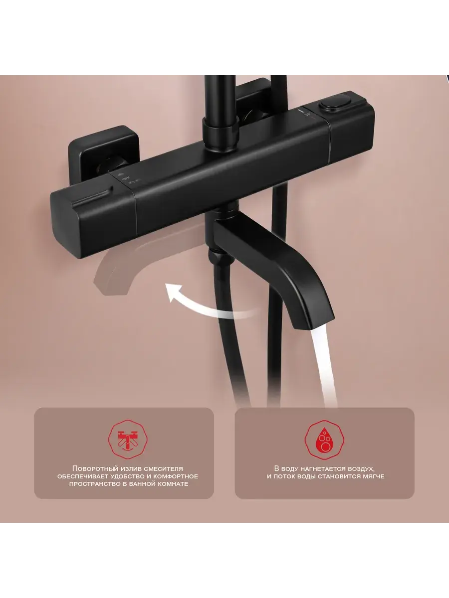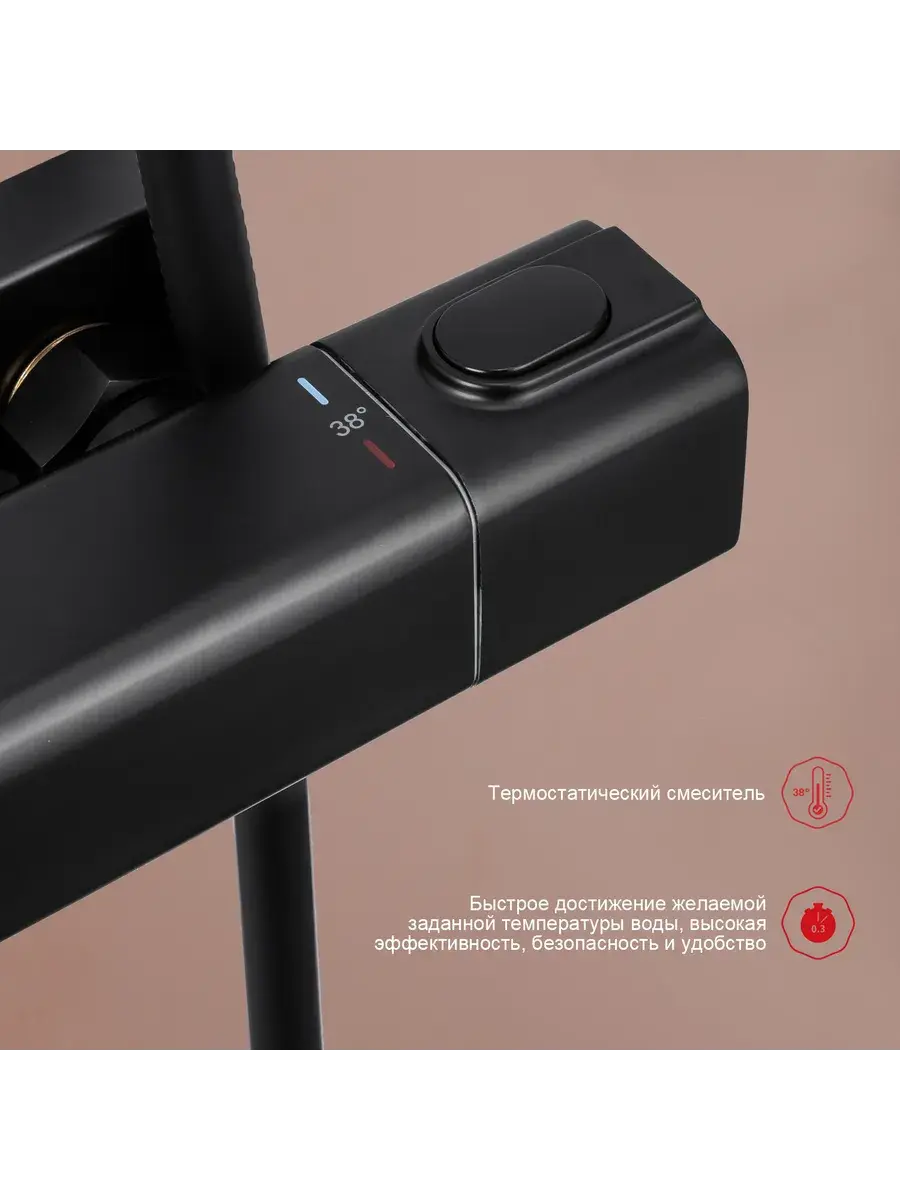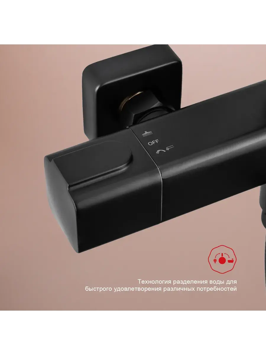 Если вы задумали ремонт ванной комнаты, советуем обратить внимание на душевую систему с термостатом R22.261.06 в черном цвете. Гарнитур разработан немецким брендом по оригинальной технологии, что гарантирует высокое качество, надежность и долговечность. Наш магазин - официальный дилер Raglo в России. Мы поставляем только оригинальную продукцию и даем 5 лет гарантии на изделия. Душевая система включает в себя смеситель, тропический душ и ручную лейку. Предусмотрено 3 режима подачи воды. Задвинув металлический кран, можно переключить воду на гибкий душевой шланг со съемной ручной лейкой. После этого поворотный кран позволит переключить водный поток на тропический душ с массажным эффектом. Также плоскую лейку можно закрепить в держателе на стойке - штанге. Выдвижная телескопическая стальная палка с креплением позволяет установить верхнюю насадку на том уровне, который будет вам максимально удобен. Встроенный мгновенный терморегулятор с датчиком обеспечивает защиту от перепадов температуры и ожогов. Есть кнопка фиксации безопасной температуры. Высокочувствительный переключатель с ручным управлением позволяет настроить термостатический регулятор максимально точно, с учетом ваших потребностей. Также вы можете дополнительно приобрести в нашем магазине шланг - переходник для подключения системы. Встраиваемую систему легко закрепить на стене или стенке душевой кабины с помощью скрытого настенного крепежа в комплекте. ВНИМАНИЕ! Чтобы термостат в сантехнике работал корректно, необходимо подвести горячую воду слева, а холодную справа.