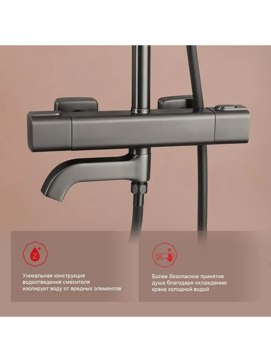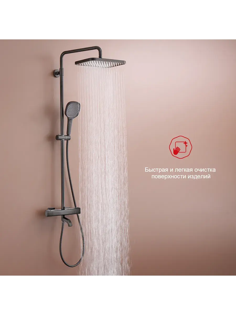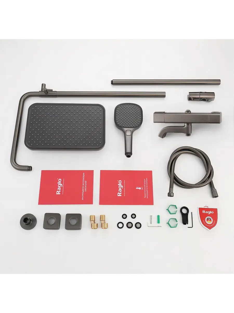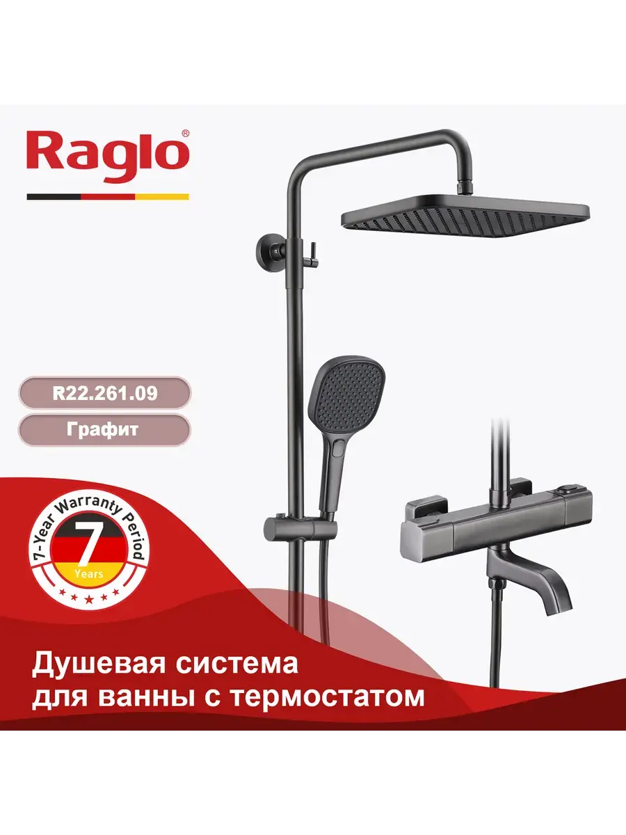 Если вы задумали ремонт ванной комнаты, советуем обратить внимание на душевую систему с термостатом R22.261.09 в графитовом цвете. Гарнитур разработан немецким брендом по оригинальной технологии, что гарантирует высокое качество, надежность и долговечность. Наш магазин - официальный дилер Raglo в России. Мы поставляем только оригинальную продукцию и даем 5 лет гарантии на изделия. Душевая система включает в себя смеситель, тропический душ и ручную лейку. Предусмотрено 3 режима подачи воды. Задвинув металлический кран, можно переключить воду на гибкий душевой шланг со съемной ручной лейкой. После этого поворотный кран позволит переключить водный поток на тропический душ с массажным эффектом. Также плоскую лейку можно закрепить в держателе на стойке - штанге. Выдвижная телескопическая стальная палка с креплением позволяет установить верхнюю насадку на том уровне, который будет вам максимально удобен. Встроенный мгновенный терморегулятор с датчиком обеспечивает защиту от перепадов температуры и ожогов. Есть кнопка фиксации безопасной температуры. Высокочувствительный переключатель с ручным управлением позволяет настроить термостатический регулятор максимально точно, с учетом ваших потребностей. Также вы можете дополнительно приобрести в нашем магазине шланг - переходник для подключения системы. Встраиваемую систему легко закрепить на стене или стенке душевой кабины с помощью скрытого настенного крепежа в комплекте. ВНИМАНИЕ! Чтобы термостат в сантехнике работал корректно, необходимо подвести горячую воду слева, а холодную справа.