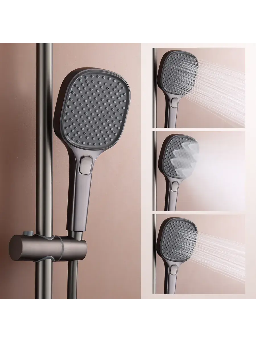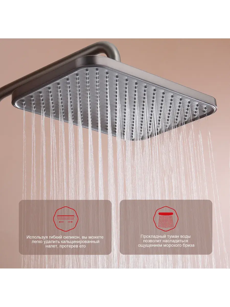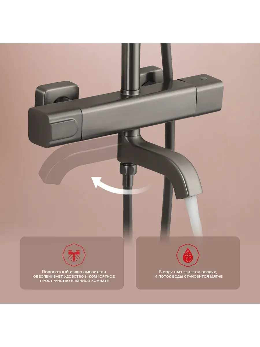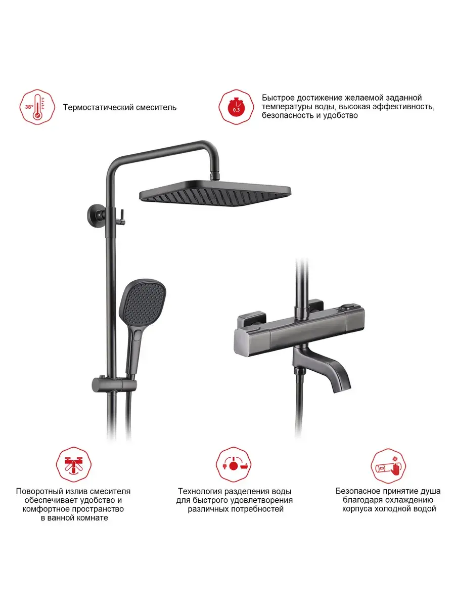 Если вы задумали ремонт ванной комнаты, советуем обратить внимание на душевую систему с термостатом R22.261.09 в графитовом цвете. Гарнитур разработан немецким брендом по оригинальной технологии, что гарантирует высокое качество, надежность и долговечность. Наш магазин - официальный дилер Raglo в России. Мы поставляем только оригинальную продукцию и даем 5 лет гарантии на изделия. Душевая система включает в себя смеситель, тропический душ и ручную лейку. Предусмотрено 3 режима подачи воды. Задвинув металлический кран, можно переключить воду на гибкий душевой шланг со съемной ручной лейкой. После этого поворотный кран позволит переключить водный поток на тропический душ с массажным эффектом. Также плоскую лейку можно закрепить в держателе на стойке - штанге. Выдвижная телескопическая стальная палка с креплением позволяет установить верхнюю насадку на том уровне, который будет вам максимально удобен. Встроенный мгновенный терморегулятор с датчиком обеспечивает защиту от перепадов температуры и ожогов. Есть кнопка фиксации безопасной температуры. Высокочувствительный переключатель с ручным управлением позволяет настроить термостатический регулятор максимально точно, с учетом ваших потребностей. Также вы можете дополнительно приобрести в нашем магазине шланг - переходник для подключения системы. Встраиваемую систему легко закрепить на стене или стенке душевой кабины с помощью скрытого настенного крепежа в комплекте. ВНИМАНИЕ! Чтобы термостат в сантехнике работал корректно, необходимо подвести горячую воду слева, а холодную справа.