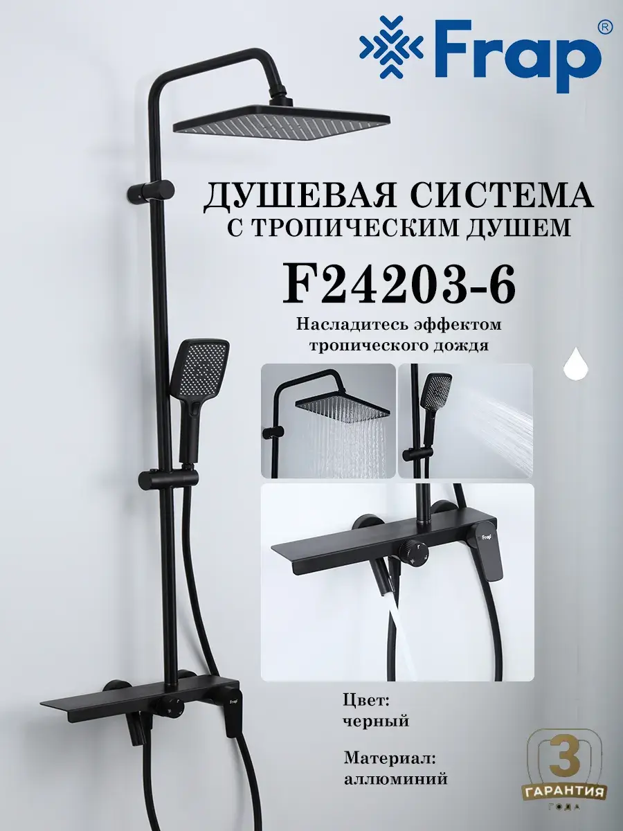 Душевая система со смесителем стойка комплект с тропическим душем для ванной комнаты латунь Frap F24203-6 - это идеальное решение для вашей ванной комнаты. Она выполнена из высококачественной из алюминия, что гарантирует ее долговечность и надежность. Смеситель для ванны со стойкой с душем тропический для ванны с душем оснащена смесителем с однорычажным переключением и поворотным изливом, ручной душевой лейкой и верхним тропическим душем. Благодаря испанскому керамическому картриджу SEDAL и качественному аэратору NEOPERL, расход воды будет экономичным. Высота стойки для душа регулируется в пределах 870-1478 мм, а размеры верхнего душа, ручной лейки и душевого шланга обеспечивают комфортное использование. Гарантийный срок на корпус и покрытие составляет 3 года, а на комплектующие - 1 год. Бренд GAPPO известен своим качеством и надежностью, а черное матовое покрытие придает системе элегантный и стильный вид. Тропический душ комплект с смесителем душевую стойку Frap F24203-6, вы получаете не только функциональность, но и прекрасное дополнение к интерьеру вашей ванной комнаты.