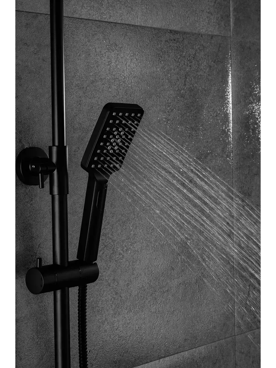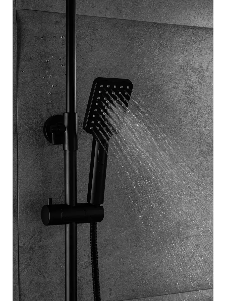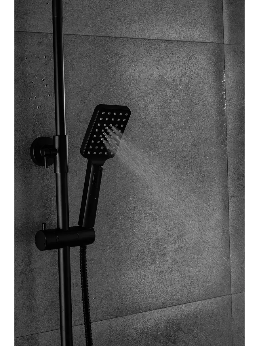 Душевой гарнитур F2462 с телескопической штангой идеален для современных ванных комнат. Матовый черный цвет создаёт элегантный внешний вид, а использование латуни гарантирует долговечность и надежность. Кран в ванную с душем оснащён удобным переключателем для подачи воды. Телескопический механизм обеспечивает простую регулировку высоты.
