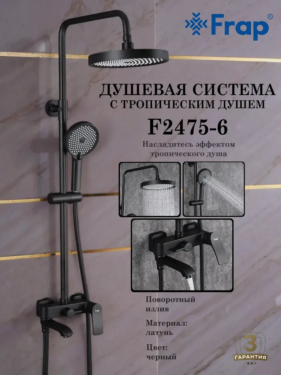 Душевая система со смесителем стойка комплект с тропическим душем для ванной комнаты латунь Frap F2475-6 - это идеальное решение для вашей ванной комнаты. Она выполнена из высококачественной латуни, что гарантирует ее долговечность и надежность. Смеситель для ванны со стойкой с душем тропический для ванны с душем оснащена смесителем с однорычажным переключением и поворотным изливом, ручной душевой лейкой и верхним тропическим душем. Благодаря испанскому керамическому картриджу SEDAL и качественному аэратору NEOPERL, расход воды будет экономичным. Высота стойки для душа регулируется в пределах 870-1495 мм, а размеры верхнего душа, ручной лейки и душевого шланга обеспечивают комфортное использование. Гарантийный срок на корпус и покрытие составляет 3 года, а на комплектующие - 1 год. Бренд GAPPO известен своим качеством и надежностью, а хромированное покрытие придает системе элегантный и стильный вид. Тропический душ комплект с смесителем душевую стойку Frap F2475-6, вы получаете не только функциональность, но и прекрасное дополнение к интерьеру вашей ванной комнаты.