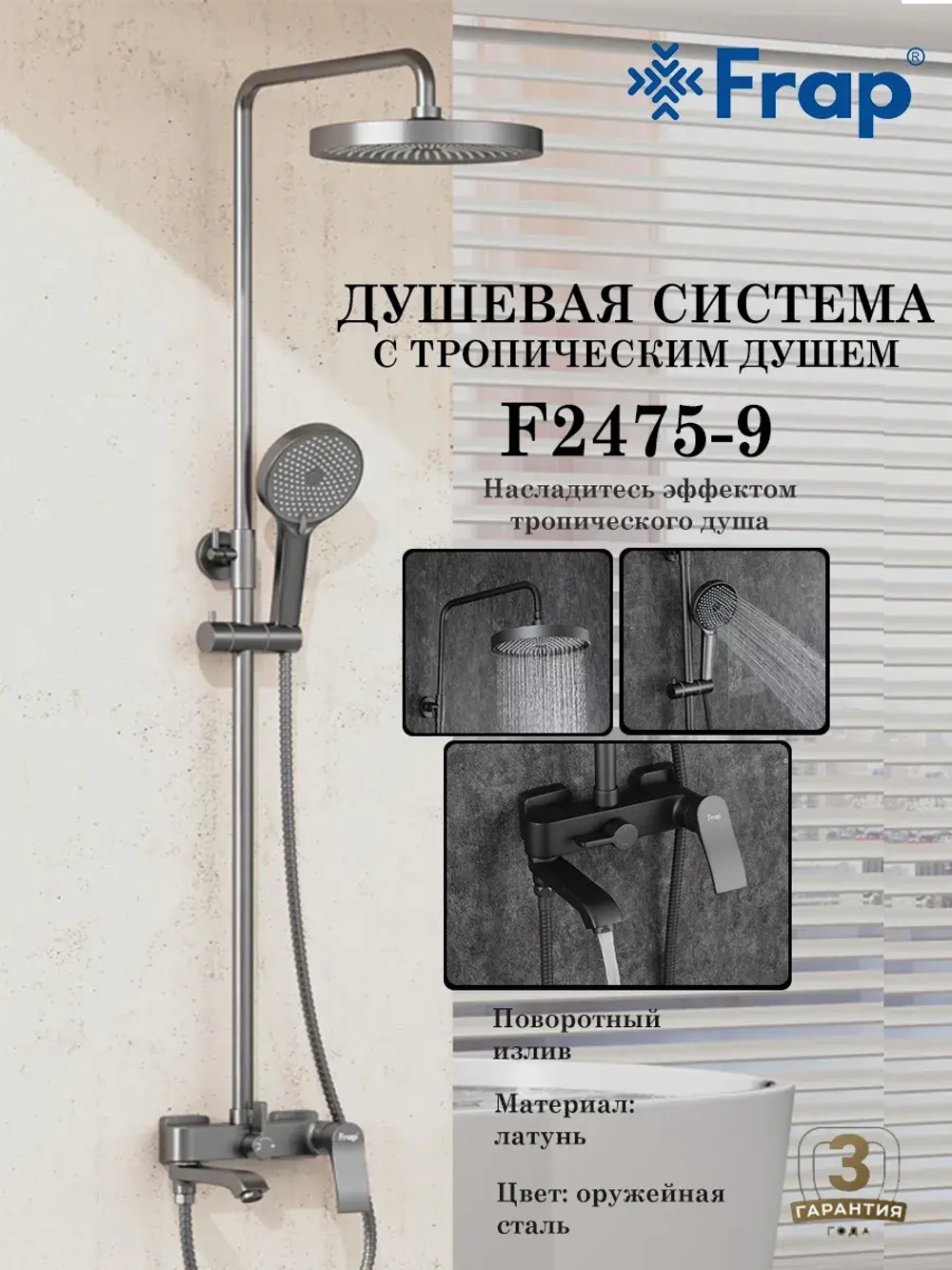 Душевая система со смесителем стойка комплект с тропическим душем для ванной комнаты латунь Frap F2475-9 - это идеальное решение для вашей ванной комнаты. Она выполнена из высококачественной латуни, что гарантирует ее долговечность и надежность. Смеситель для ванны со стойкой с душем тропический для ванны с душем оснащена смесителем с однорычажным переключением и поворотным изливом, ручной душевой лейкой и верхним тропическим душем. Благодаря испанскому керамическому картриджу SEDAL и качественному аэратору NEOPERL, расход воды будет экономичным. Высота стойки для душа регулируется в пределах 870-1495 мм, а размеры верхнего душа, ручной лейки и душевого шланга обеспечивают комфортное использование. Гарантийный срок на корпус и покрытие составляет 3 года, а на комплектующие - 1 год. Бренд GAPPO известен своим качеством и надежностью, а хромированное покрытие придает системе элегантный и стильный вид. Тропический душ комплект с смесителем душевую стойку Frap F2475-9, вы получаете не только функциональность, но и прекрасное дополнение к интерьеру вашей ванной комнаты.