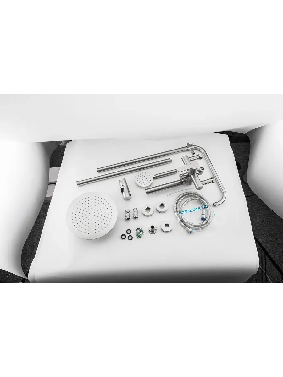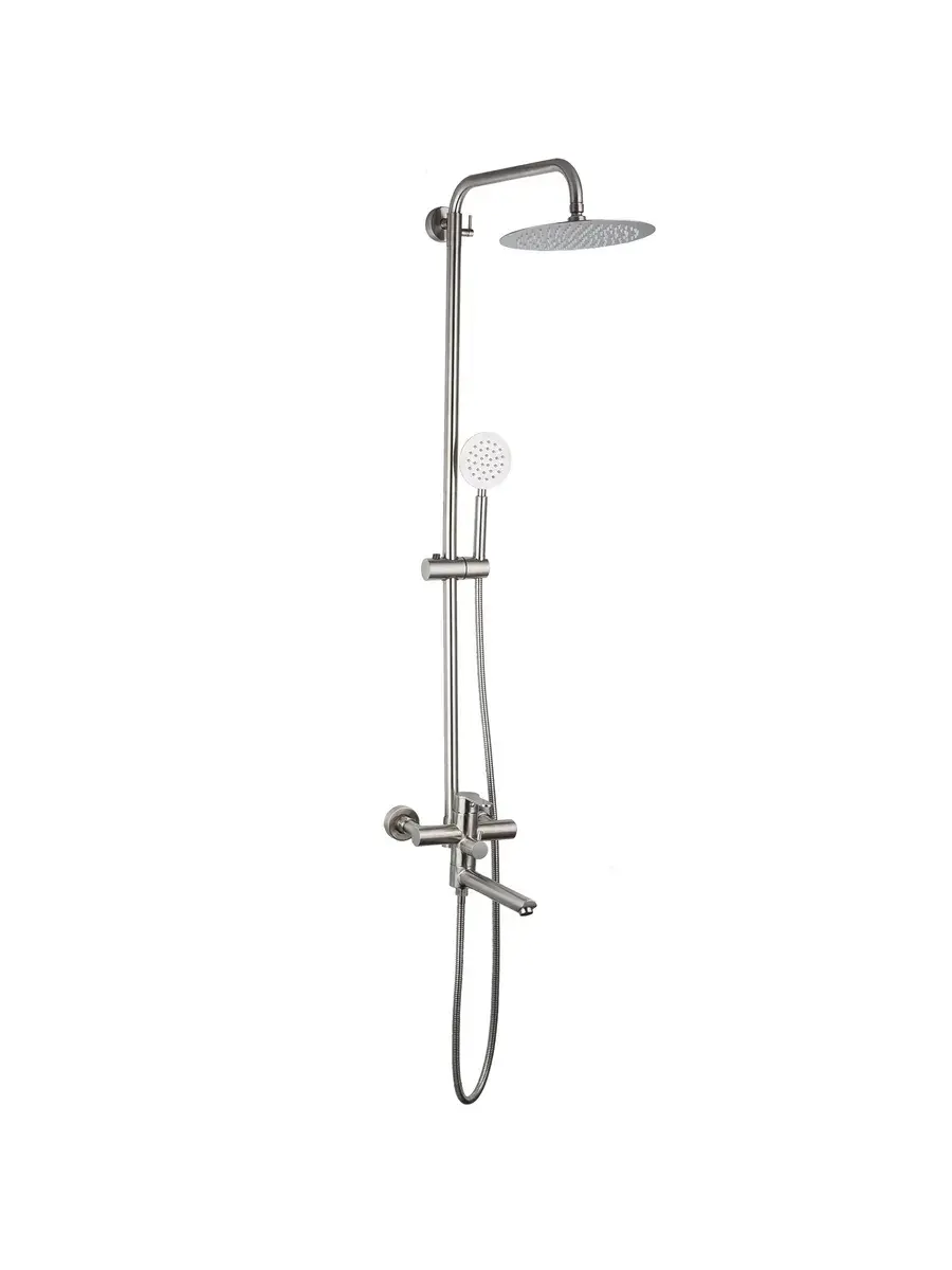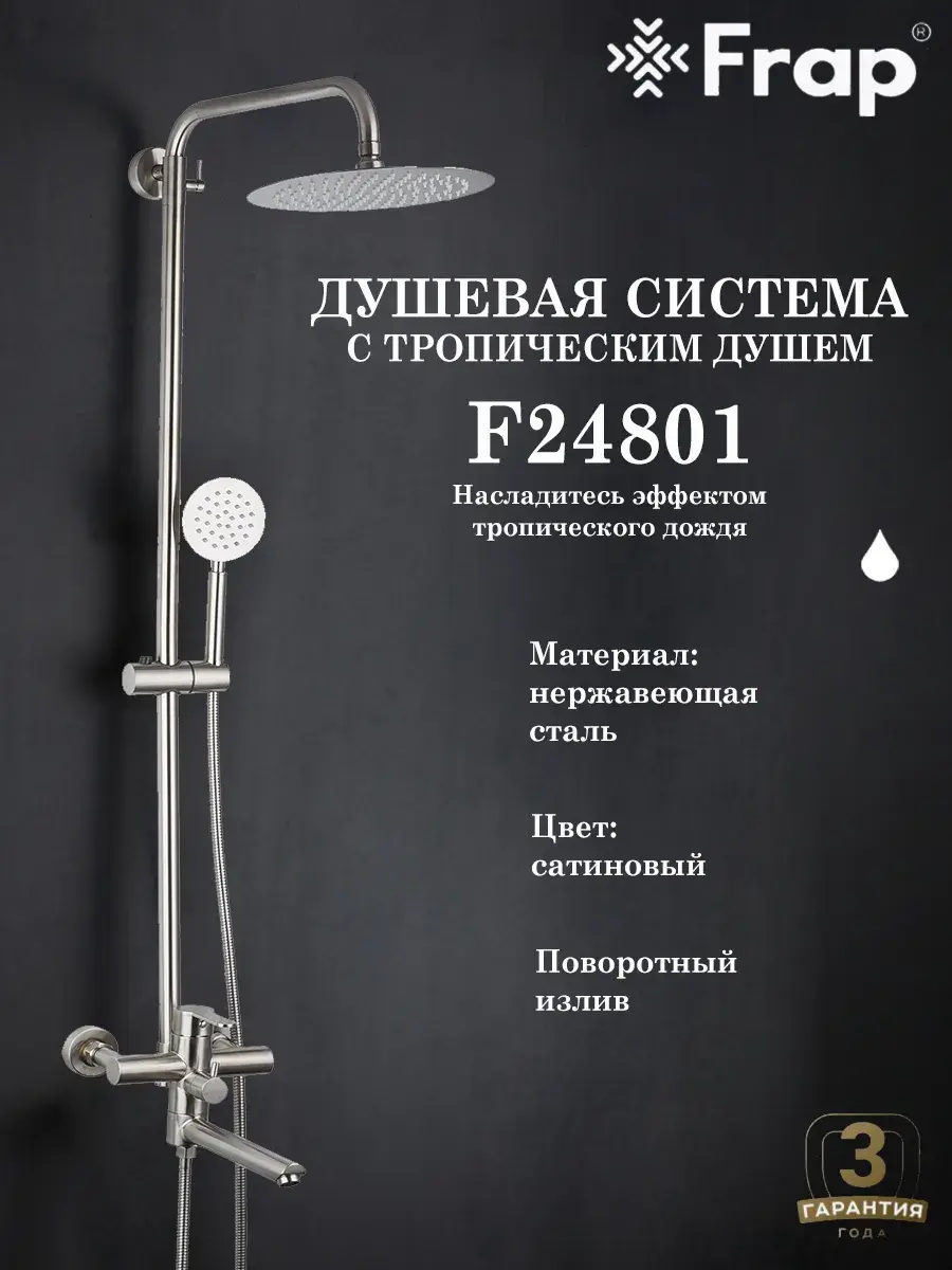 Настенная душевая система с изливом F24801 Frap - продукция класса люкс европейского качества - лучшее душевое оборудование из коллекции немецкой сантехники с гарантией 3 года на корпус и 1 год на комплектующие. Душевой гарнитур из нержавеющей стали украсит интерьер ванной комнаты или душевой кабины, порадует стильным дизайном и комфортом дома или на даче. Предусмотрено 3 режима подачи воды. Переключение давления воды с короткого излива на выдвижной гибкий шланг со съемной лейкой производится поворотом излива, а на верхний плоский душ при повернутом изливе поворотным краном-переключателем. Душевой гарнитур идеально впишется в интерьер вашей ванной комнаты.