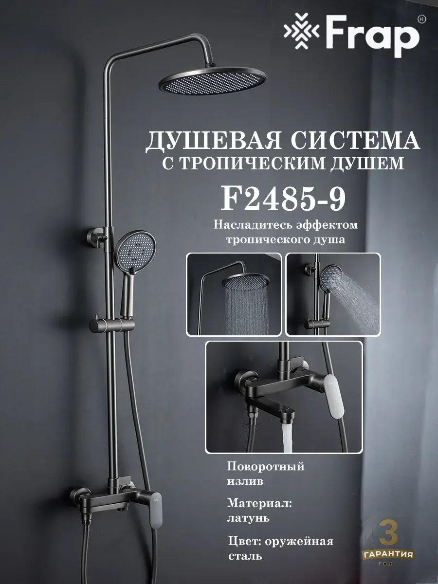Душевая система со смесителем стойка комплект с тропическим душем для ванной комнаты латунь Frap F2485-9 - это идеальное решение для вашей ванной комнаты. Она выполнена из высококачественной латуни, что гарантирует ее долговечность и надежность. Смеситель для ванны со стойкой с душем тропический для ванны с душем оснащена смесителем с однорычажным переключением и поворотным изливом, ручной душевой лейкой и верхним тропическим душем. Благодаря испанскому керамическому картриджу SEDAL и качественному аэратору NEOPERL, расход воды будет экономичным. Высота стойки для душа регулируется в пределах 870-1430 мм, а размеры верхнего душа, ручной лейки и душевого шланга обеспечивают комфортное использование. Гарантийный срок на корпус и покрытие составляет 3 года, а на комплектующие - 1 год. Бренд GAPPO известен своим качеством и надежностью, а хромированное покрытие придает системе элегантный и стильный вид. Тропический душ комплект с смесителем душевую стойку Frap F2484-9, вы получаете не только функциональность, но и прекрасное дополнение к интерьеру вашей ванной комнаты.