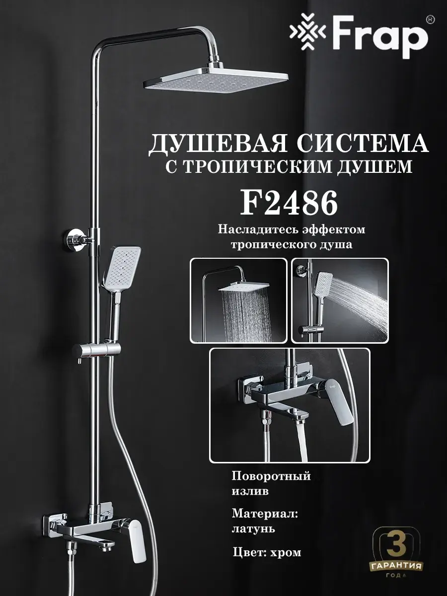 Душевая система со смесителем стойка комплект с тропическим душем для ванной комнаты латунь Frap F2486 - это идеальное решение для вашей ванной комнаты. Она выполнена из высококачественной латуни, что гарантирует ее долговечность и надежность. Смеситель для ванны со стойкой с душем тропический для ванны с душем оснащена смесителем с однорычажным переключением и поворотным изливом, ручной душевой лейкой и верхним тропическим душем. Благодаря испанскому керамическому картриджу SEDAL и качественному аэратору NEOPERL, расход воды будет экономичным. Высота стойки для душа регулируется в пределах 870-1334 мм, а размеры верхнего душа, ручной лейки и душевого шланга обеспечивают комфортное использование. Гарантийный срок на корпус и покрытие составляет 3 года, а на комплектующие - 1 год. Бренд GAPPO известен своим качеством и надежностью, а хромированное покрытие придает системе элегантный и стильный вид. Тропический душ комплект с смесителем душевую стойку Frap F2486, вы получаете не только функциональность, но и прекрасное дополнение к интерьеру вашей ванной комнаты.