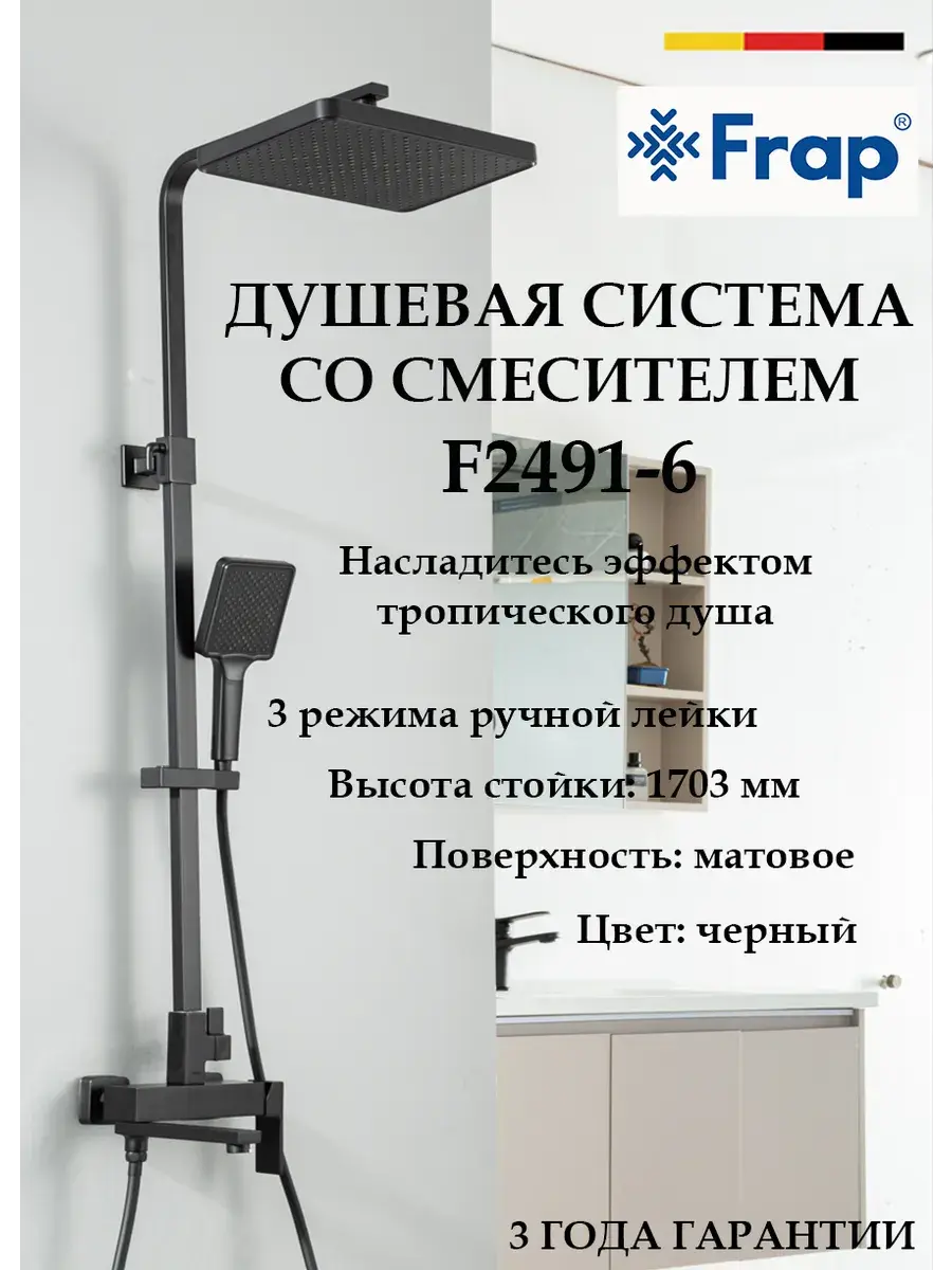 Душевая система со смесителем стойка комплект с тропическим душем для ванной комнаты латунь Frap F2491-6 - это идеальное решение для вашей ванной комнаты. Она выполнена из высококачественной латуни, что гарантирует ее долговечность и надежность. Смеситель для ванны со стойкой с душем тропический для ванны с душем оснащена смесителем с однорычажным переключением и поворотным изливом, ручной душевой лейкой и верхним тропическим душем. Благодаря испанскому керамическому картриджу SEDAL и качественному аэратору NEOPERL, расход воды будет экономичным. Высота стойки для душа регулируется в пределах 1150-1700 мм, а размеры верхнего душа, ручной лейки и душевого шланга обеспечивают комфортное использование. Гарантийный срок на корпус и покрытие составляет 3 года, а на комплектующие - 1 год. Бренд GAPPO известен своим качеством и надежностью, а хромированное покрытие придает системе элегантный и стильный вид. Тропический душ комплект с смесителем душевую стойку Frap F2491-6, вы получаете не только функциональность, но и прекрасное дополнение к интерьеру вашей ванной комнаты.