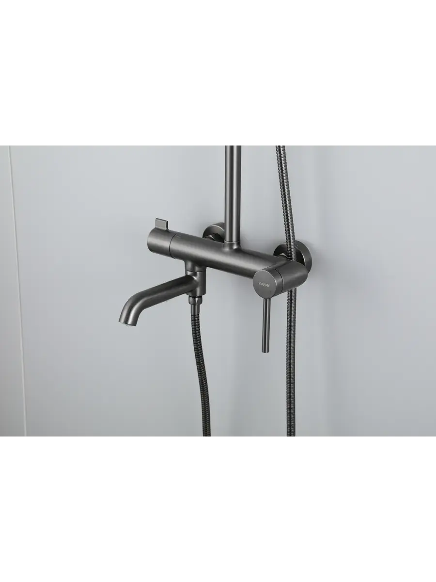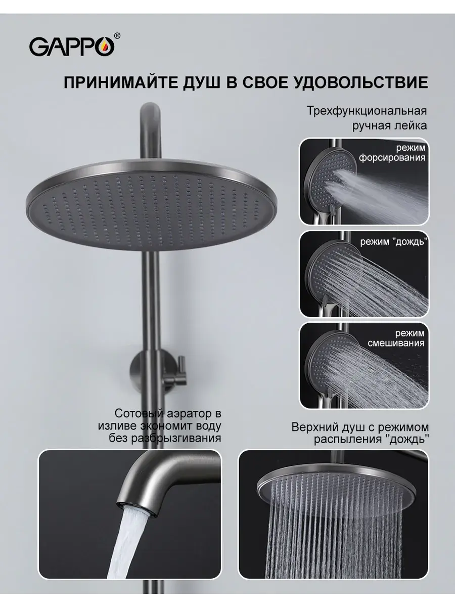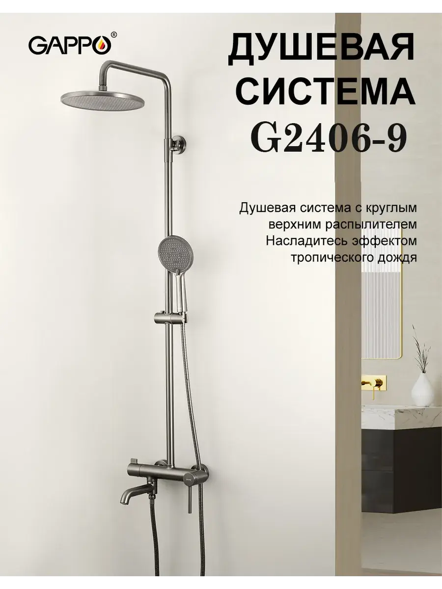 Душевая система со смесителем стойка комплект с тропическим душем для ванной комнаты латунь GAPPO G2406-9 - это идеальное решение для вашей ванной комнаты. Она выполнена из высококачественной латуни, что гарантирует ее долговечность и надежность. Высота стойки для душа регулируется в пределах 1150-1628 мм, а размеры верхнего душа, ручной лейки и душевого шланга обеспечивают комфортное использование. Гарантийный срок на корпус и покрытие составляет 5 лет, а на комплектующие - 1 год. Бренд GAPPO известен своим качеством и надежностью, а графитовое покрытие придает системе элегантный и стильный вид. Сантехника GAPPO - это сочетание функциональности, стиля и надежности. Выбирая душевую систему GAPPO G2406-9, вы получаете не только качественную сантехнику, но и стильное дополнение к интерьеру вашей ванной комнаты.