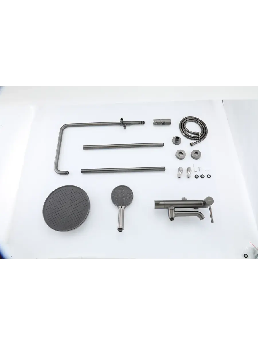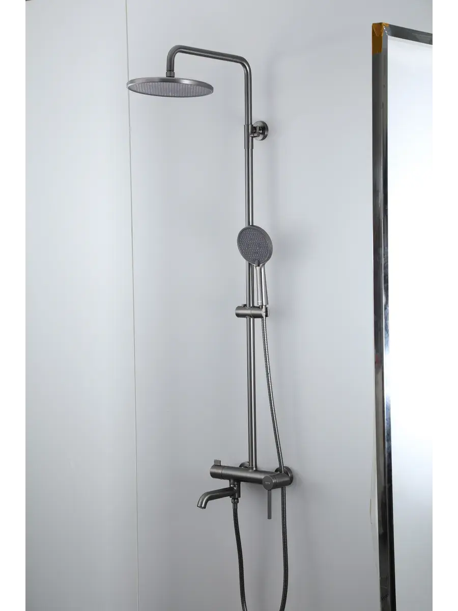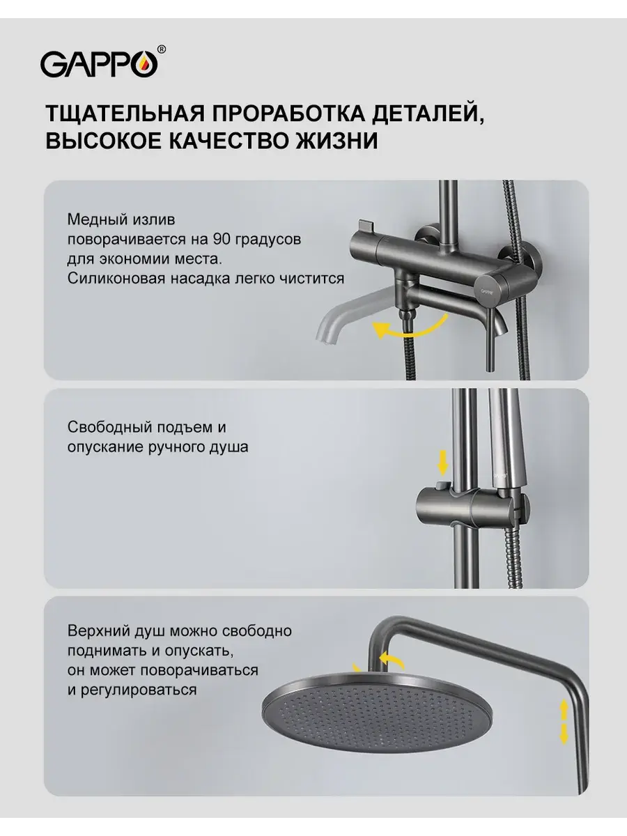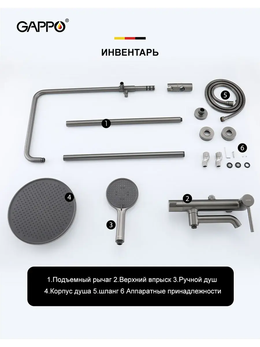 Душевая система со смесителем стойка комплект с тропическим душем для ванной комнаты латунь GAPPO G2406-9 - это идеальное решение для вашей ванной комнаты. Она выполнена из высококачественной латуни, что гарантирует ее долговечность и надежность. Высота стойки для душа регулируется в пределах 1150-1628 мм, а размеры верхнего душа, ручной лейки и душевого шланга обеспечивают комфортное использование. Гарантийный срок на корпус и покрытие составляет 5 лет, а на комплектующие - 1 год. Бренд GAPPO известен своим качеством и надежностью, а графитовое покрытие придает системе элегантный и стильный вид. Сантехника GAPPO - это сочетание функциональности, стиля и надежности. Выбирая душевую систему GAPPO G2406-9, вы получаете не только качественную сантехнику, но и стильное дополнение к интерьеру вашей ванной комнаты.