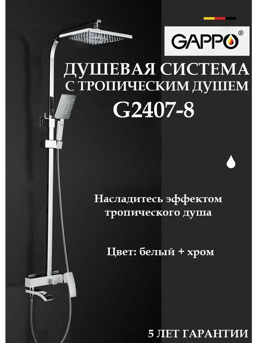 Душевой гарнитур GAPPO G2407-8 - это полный комплект для монтажа на стену сантехники для вашей ванной комнаты. Включает в себя тропический душ, душевую лейку, держатель душевой лейки на штанге и душевой шланг. Этот комплект идеально подойдет для установки в душевые кабины различных размеров. Душевая стойка GAPPO отличается высоким качеством и долговечностью, благодаря чему вы сможете наслаждаться комфортным и гигиеническим душем на протяжении многих лет. Панель системы выполнена из латуни с хромированным покрытием, что придает ей элегантный и современный вид. Кроме того, в комплекте предусмотрен гигиенический кран, который обеспечивает быстрый и удобный доступ к воде. Сантехника GAPPO - это сочетание функциональности, стиля и надежности. Выбирая душевую систему GAPPO G2407-8, вы получаете не только качественную сантехнику, но и стильное дополнение к интерьеру вашей ванной комнаты.
