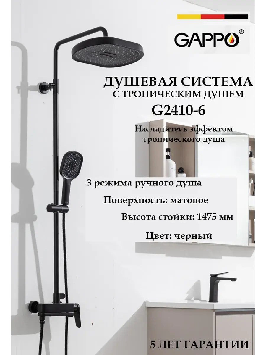 Душевой гарнитур GAPPO G2410-6 - это полный комплект для монтажа на стену сантехники для вашей ванной комнаты. Включает в себя тропический душ, душевую лейку, держатель душевой лейки на штанге и душевой шланг. Душевая стойка GAPPO отличается высоким качеством и долговечностью, благодаря чему вы сможете наслаждаться комфортным душем на протяжении многих лет. Корпус системы выполнена из латуни с черным покрытием, что придает ей элегантный и современный вид. Сантехника GAPPO - это сочетание функциональности, стиля и надежности. Выбирая душевую систему GAPPO G2410-6, вы получаете не только качественную сантехнику, но и стильное дополнение к интерьеру вашей ванной комнаты.