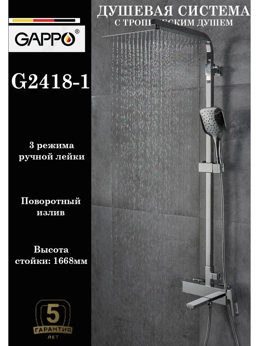 Душевая система со смесителем стойка комплект с тропическим душем для ванной комнаты латунь GAPPO G2418-1 - это идеальное решение для вашей ванной комнаты. Она выполнена из высококачественной латуни, что гарантирует ее долговечность и надежность. Смеситель для ванны со стойкой с душем тропический для ванны с душем оснащена смесителем с однорычажным переключением и стационарным каскадным изливом, ручной душевой лейкой и верхним тропическим душем. Благодаря испанскому керамическому картриджу SEDAL и качественному аэратору NEOPERL, расход воды будет экономичным. Высота стойки для душа регулируется в пределах 1000-1668 мм, а размеры верхнего душа, ручной лейки и душевого шланга обеспечивают комфортное использование. Гарантийный срок на корпус и покрытие составляет 5 лет, а на комплектующие - 1 год. Бренд GAPPO известен своим качеством и надежностью, а хромированное покрытие придает системе элегантный и стильный вид. Тропический душ комплект с смесителем душевую стойку GAPPO G2418-1, вы получаете не только функциональность, но и прекрасное дополнение к интерьеру вашей ванной комнаты.