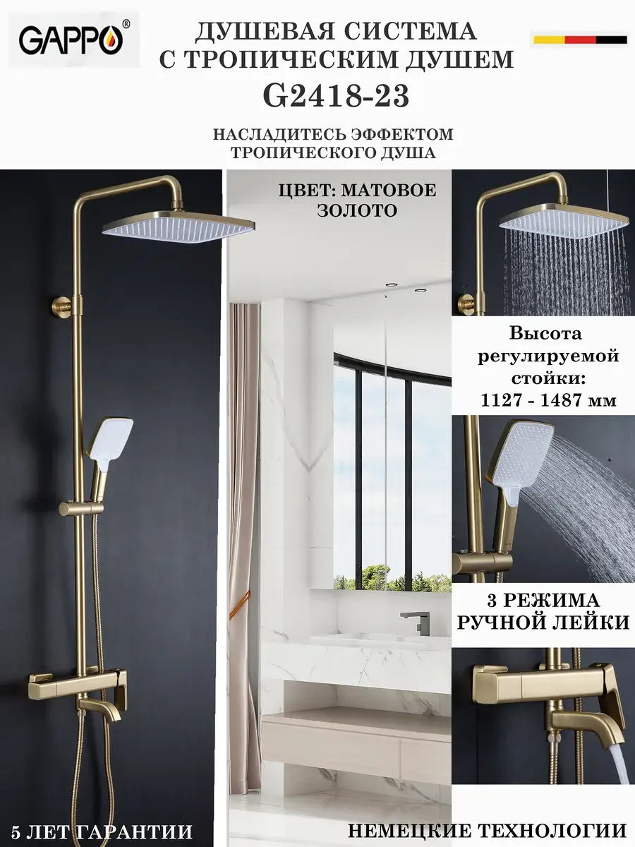 Душевой гарнитур GAPPO G2418-23 - это полный комплект для монтажа на стену сантехники для вашей ванной комнаты. Включает в себя тропический душ, душевую лейку, держатель душевой лейки на штанге и душевой шланг. Этот комплект идеально подойдет для установки в душевые кабины различных размеров. Душевая стойка GAPPO отличается высоким качеством и долговечностью, благодаря чему вы сможете наслаждаться комфортным и гигиеническим душем на протяжении многих лет. Панель системы выполнена из латуни с матовым покрытием, что придает ей элегантный и современный вид. Кроме того, в комплекте предусмотрен гигиенический кран, который обеспечивает быстрый и удобный доступ к воде. Сантехника GAPPO - это сочетание функциональности, стиля и надежности. Выбирая душевую систему GAPPO G2418-23, вы получаете не только качественную сантехнику, но и стильное дополнение к интерьеру вашей ванной комнаты.