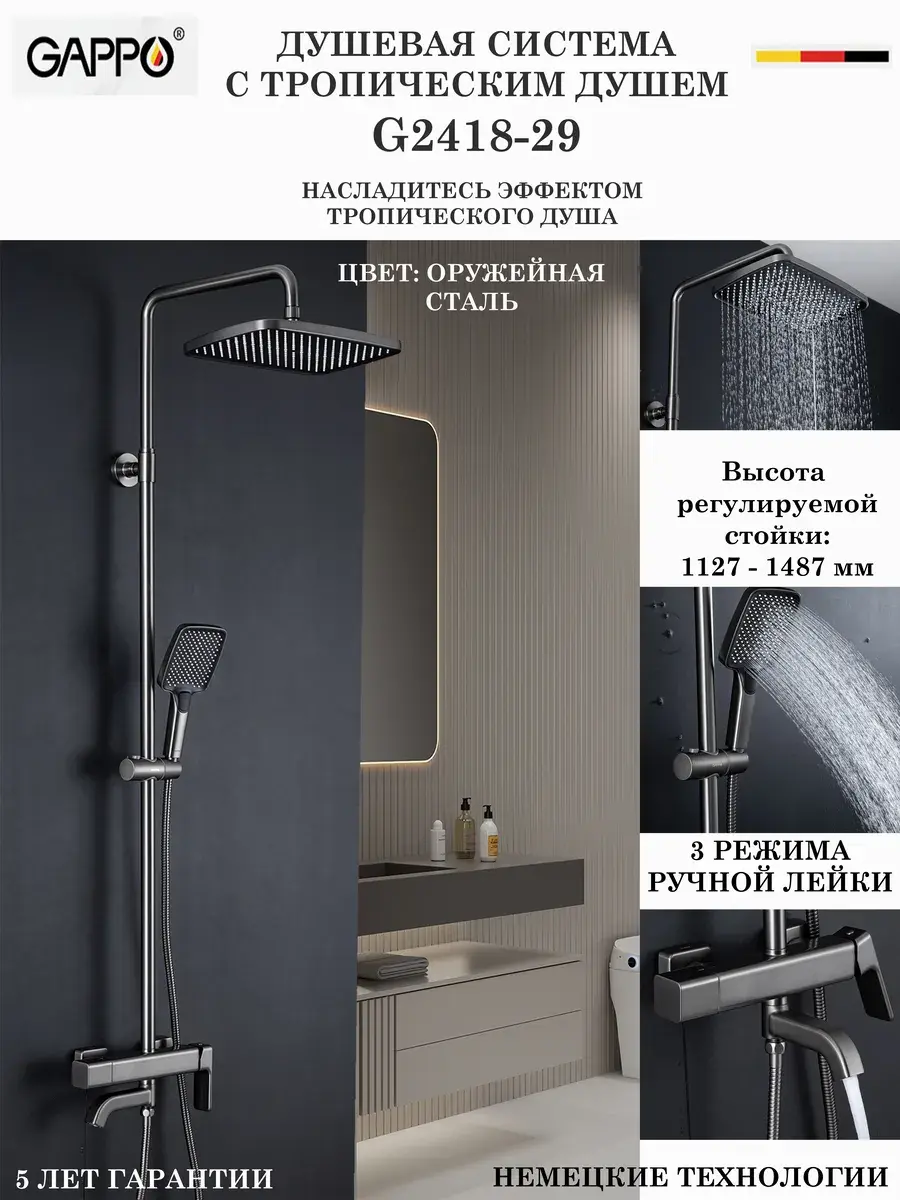 Душевая система со смесителем стойка комплект с тропическим душем для ванной комнаты латунь GAPPO G2418-29 - это идеальное решение для вашей ванной комнаты. Она выполнена из высококачественной латуни, что гарантирует ее долговечность и надежность. Смеситель для ванны со стойкой с душем тропический для ванны с душем оснащена смесителем с однорычажным переключением и стационарным каскадным изливом, ручной душевой лейкой и верхним тропическим душем. Благодаря испанскому керамическому картриджу SEDAL и качественному аэратору NEOPERL, расход воды будет экономичным. Высота стойки для душа регулируется в пределах 1000-1480 мм, а размеры верхнего душа, ручной лейки и душевого шланга обеспечивают комфортное использование. Гарантийный срок на корпус и покрытие составляет 5 лет, а на комплектующие - 1 год. Бренд GAPPO известен своим качеством и надежностью, а хромированное покрытие придает системе элегантный и стильный вид. Тропический душ комплект с смесителем душевую стойку GAPPO G2418-29, вы получаете не только функциональность, но и прекрасное дополнение к интерьеру вашей ванной комнаты.