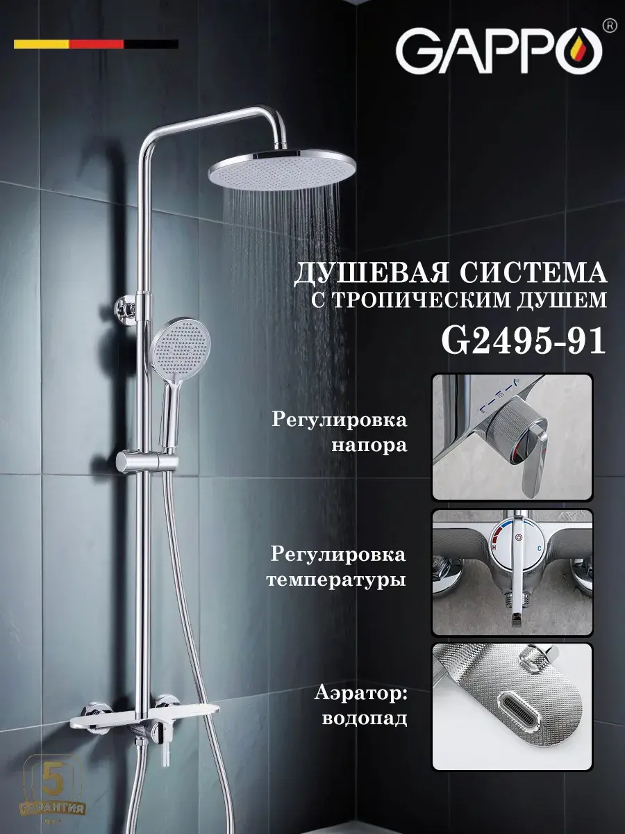 Душевая система со смесителем стойка комплект с тропическим душем для ванной комнаты латунь GAPPO G2495-91 - это идеальное решение для вашей ванной комнаты. Она выполнена из высококачественной латуни, что гарантирует ее долговечность и надежность. Смеситель для ванны со стойкой с душем тропический для ванны с душем оснащена смесителем с однорычажным переключением и стационарным каскадным изливом, ручной душевой лейкой и верхним тропическим душем. Благодаря испанскому керамическому картриджу SEDAL и качественному аэратору NEOPERL, расход воды будет экономичным. Высота стойки для душа регулируется в пределах 1130-1475 мм, а размеры верхнего душа, ручной лейки и душевого шланга обеспечивают комфортное использование. Гарантийный срок на корпус и покрытие составляет 5 лет, а на комплектующие - 1 год. Бренд GAPPO известен своим качеством и надежностью, а хромированное покрытие придает системе элегантный и стильный вид. Тропический душ комплект с смесителем душевую стойку GAPPO G2495-91, вы получаете не только функциональность, но и прекрасное дополнение к интерьеру вашей ванной комнаты.