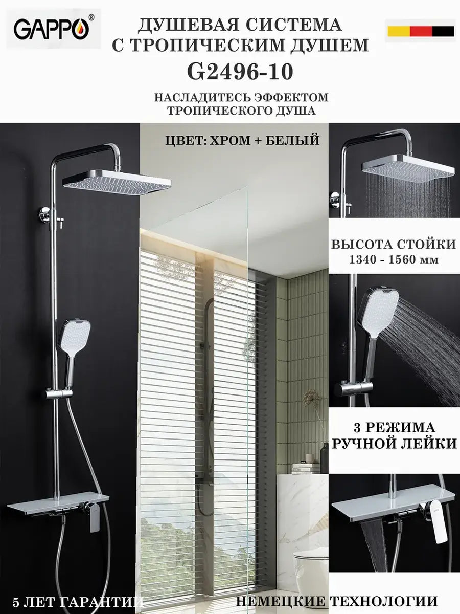 Душевая система с каскадным смесителем стойка комплект с тропическим душем для ванной комнаты латунь GAPPO G2496-10 - это идеальное решение для вашей ванной комнаты. Она выполнена из высококачественной латуни, что гарантирует ее долговечность и надежность. Смеситель для ванны со стойкой с душем тропический для ванны с душем оснащена смесителем с однорычажным переключением и стационарным каскадным изливом, ручной душевой лейкой и верхним тропическим душем. Благодаря испанскому керамическому картриджу SEDAL и качественному аэратору NEOPERL, расход воды будет экономичным. Высота стойки для душа регулируется в пределах 1150-1560 мм, а размеры верхнего душа, ручной лейки и душевого шланга обеспечивают комфортное использование. Гарантийный срок на корпус и покрытие составляет 5 лет, а на комплектующие - 1 год. Бренд GAPPO известен своим качеством и надежностью, а хромированное покрытие придает системе элегантный и стильный вид. Тропический душ комплект с смесителем душевую стойку GAPPO G2496-10, вы получаете не только функциональность, но и прекрасное дополнение к интерьеру вашей ванной комнаты.