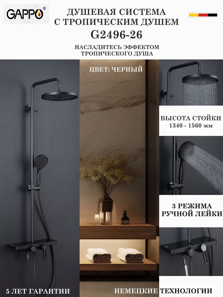 Душевая система со смесителем стойка комплект с тропическим душем для ванной комнаты латунь GAPPO G2496-26 - это идеальное решение для вашей ванной комнаты. Она выполнена из высококачественной латуни, что гарантирует ее долговечность и надежность. Смеситель для ванны со стойкой с душем тропический для ванны с душем оснащена смесителем с однорычажным переключением и стационарным каскадным изливом, ручной душевой лейкой и верхним тропическим душем. Благодаря испанскому керамическому картриджу SEDAL и качественному аэратору NEOPERL, расход воды будет экономичным. Высота стойки для душа регулируется в пределах 1150-1560 мм, а размеры верхнего душа, ручной лейки и душевого шланга обеспечивают комфортное использование. Гарантийный срок на корпус и покрытие составляет 5 лет, а на комплектующие - 1 год. Бренд GAPPO известен своим качеством и надежностью, а хромированное покрытие придает системе элегантный и стильный вид. Тропический душ комплект с смесителем душевую стойку GAPPO G2496-26, вы получаете не только функциональность, но и прекрасное дополнение к интерьеру вашей ванной комнаты.