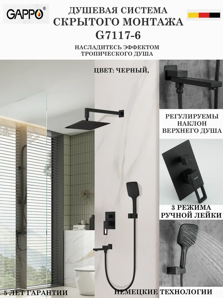 Погрузитесь в роскошь и комфорт с душевой системой GAPPO G7117-6. Этот встраиваемый душевой комплект из латуни с черным покрытием не только элегантно выглядит, но и обещает долговечность и легкость в уходе. Смеситель с лейкой, изливом и тропическим душем создает идеальное сочетание функциональности и стиля. Ручной душ с длинным шлангом обеспечивает удобство использования. Установка на стену проста, а возможность регулировать расположение элементов позволяет настроить систему под свои предпочтения. Откройте для себя роскошь и качество бренда GAPPO из Китая с этой душевой системой в черном цвете.