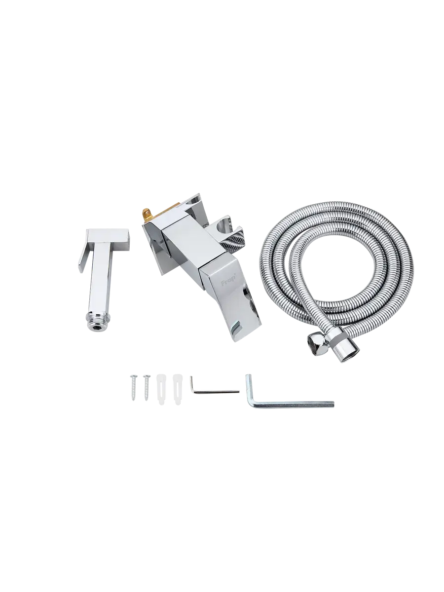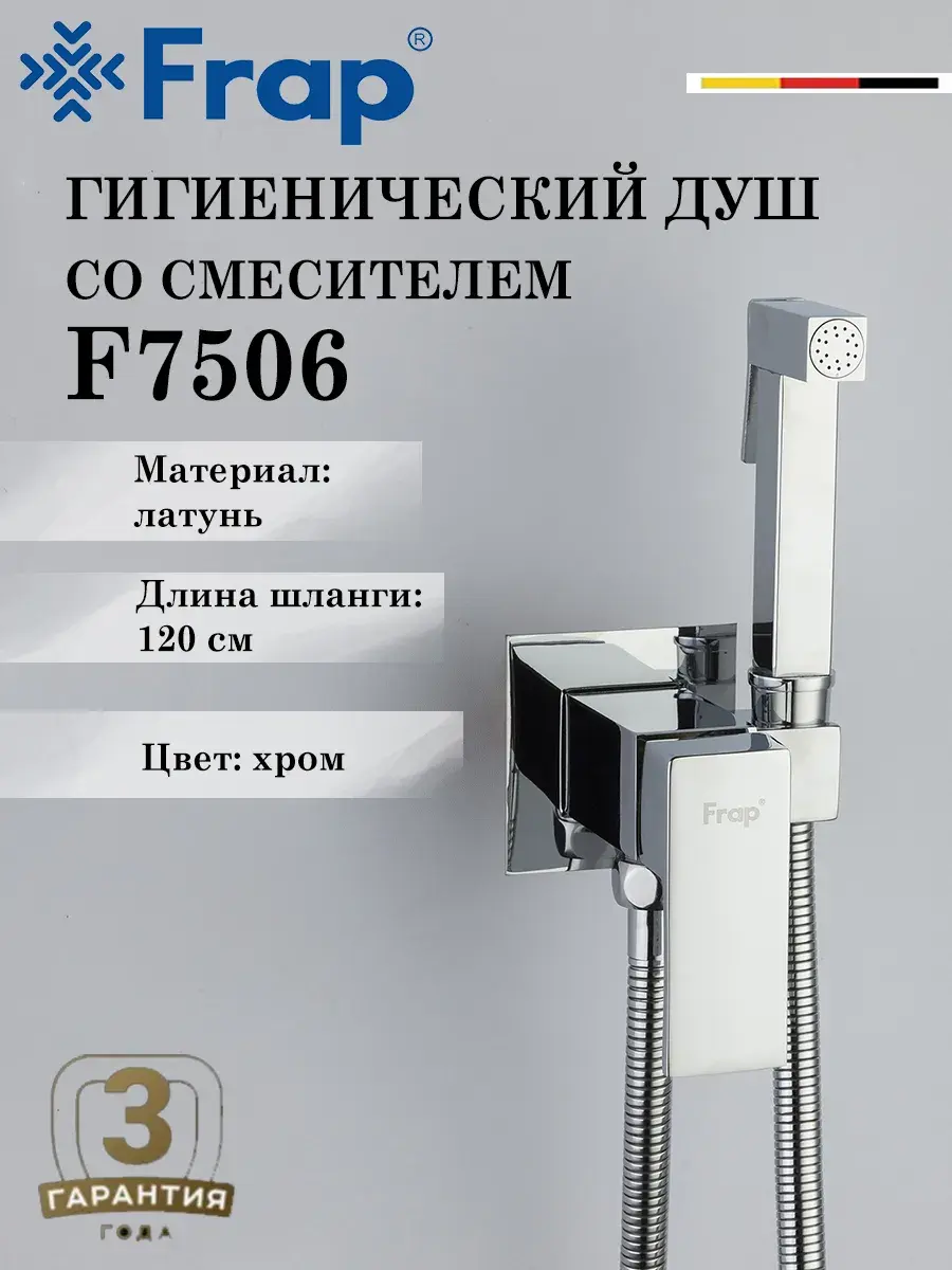 Смеситель с гигиеническим душем Frap F7506, прибор имеет одну рукоять чтобы регулировать напор воды. Настенный смеситель – это традиционный вариант, который в наши дни наиболее часто ставится в ванной. Помимо излива такие модели могут оснащаться отдельным выходом на душевой шланг. Современные приборы – это объединение традиционных конструкционных решений и одновременно с этим необычного и смелого оформления. Такая сантехника прекрасно подойдет для тех людей, кто хочет шагать в ногу с нашим временем. Материал прибора - латунь, проверенный временем красивый материал, обеспечивающий идеальное нанесение хромированного покрытия. Модель квадратной формы. Представленная модель не оснащена изливом. Представленный тип смесителя имеет керамический картридж с диаметром 25 миллиметров. Смеситель отлично смешивает потоки холодной и горячей воды, а помимо этого наделен невысоки показателем создаваемых шумов. В этом варианте предполагается, что установка смесителя производится на два отверстия, которые расположены в умывальнике или раковине. В комплекте идет, гарантийный талон, гигиенический душ , держатель лейки , душевой шланг.