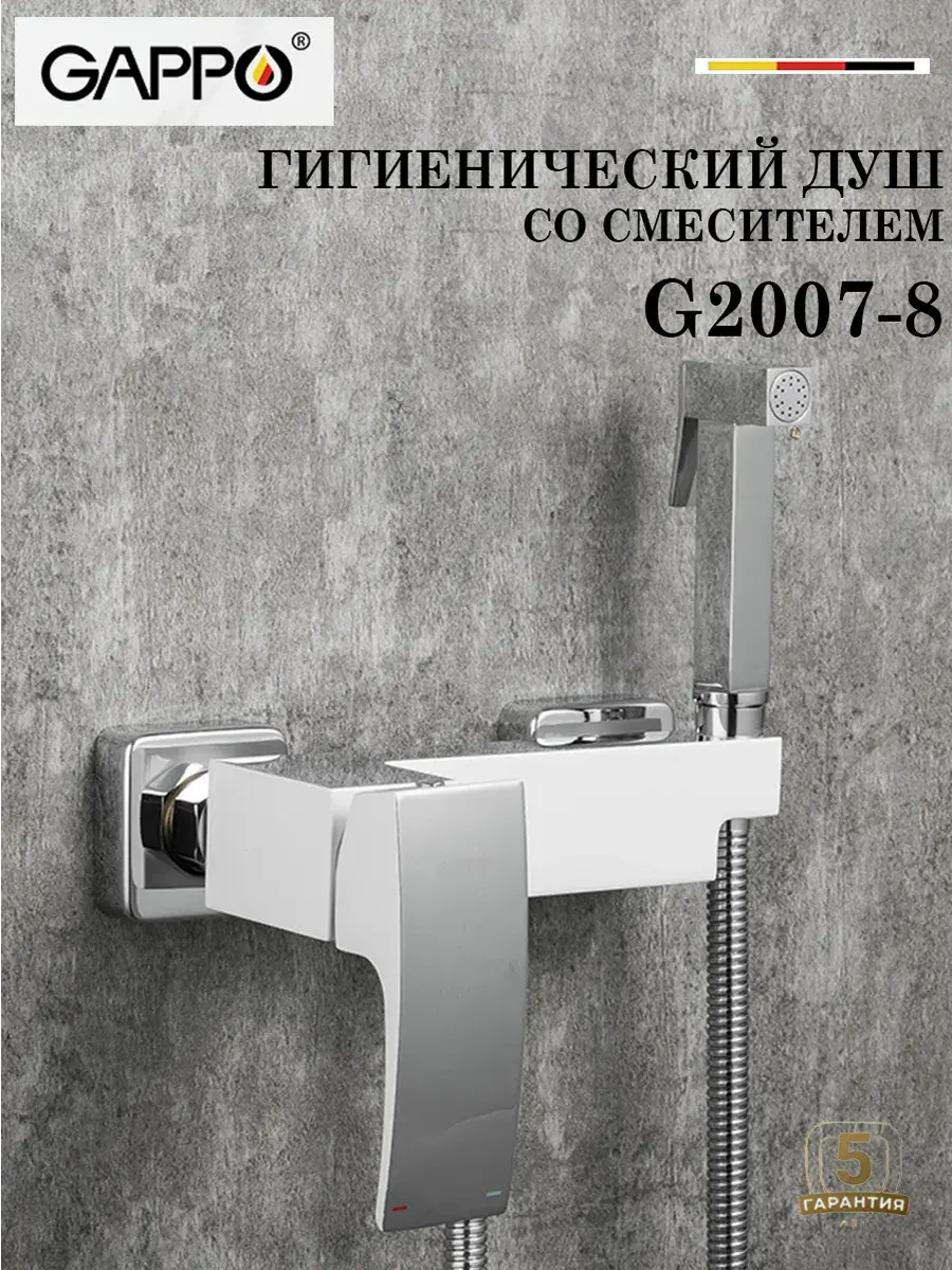Гигиенический душ со смесителем. Смеситель с гигиеническим душем Gappo G2007-8. Крепления идут в комплекте, чтобы их не было видно все скрывается квадратной накладкой, на которой размещается смеситель.Встраиваемый гигиенический душ не занимает много места. При этом он добавляет комфорта в ежедневные процедуры. Для запуска потока воды достаточно немного нажать рычаг расположенный на лейке. Напор регулируется силой нажатия. Латунная душевая лейка работает в одном режиме. Высокопрочный душевой шланг - 1200 мм в оплетки двойного вальцевания с трубкой из синтетического каучука, вращающийся на 360 градусов. Гигиенический душ поставляется в фирменной индивидуальной упаковке.. Ширина смесителя с держателем лейки - 198 мм.