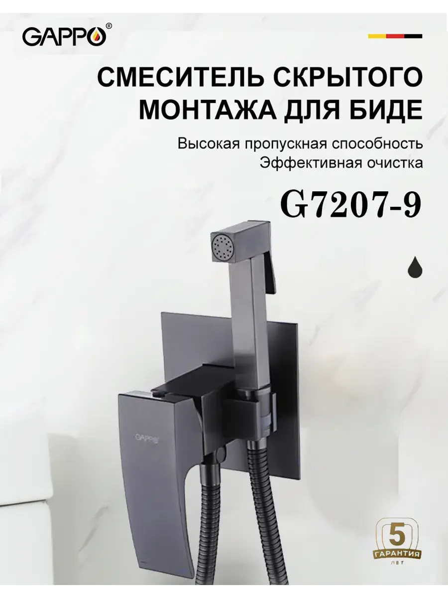Качественный и современный смеситель с гигиеническим душем Gappo G7207-9, у лейки для биде одна рукоять для того, чтобы регулировать напор воды. Смеситель для биде устанавливается прямо внутрь стены, что позволит скрыть функциональные элементы, спрятать некоторые элементы монтажа. Латунная гигиеническая лейка работает в одном режиме. Высокопрочный душевой шланг 120 см в оплетке двойного вальцевания с трубкой из синтетического каучука вращающийся на 360 градусов. Аэратор Neoperl гарантирует ровный и мягкий поток воды без брызг. Квадратная форма душ для биде делает его оригинальным и аутентичным. ВАЖНО: после того, как вы завершите мытье, прибор к которому присоединяется шланг с лейкой, необходимо переводить в режим отключения от напора воды, то есть попросту выключать. Постоянное давление на стенки шланга способствует стремительному износу и очень сильно сокращает время его использования.