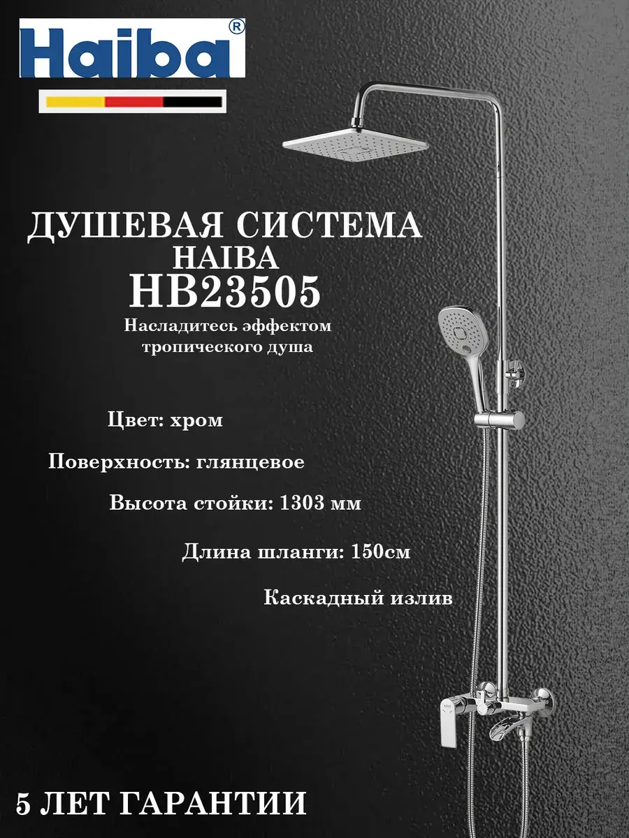 Душевая система Haiba HB23505 разработана по последним технологиям и имеет современный и стильный дизайн, выполнена в хромированном цвете. Фирменный керамический картридж обеспечивает плавность хода джойстика, качество смешивания воды и надежность запорного механизма. Предусмотрена регулировка тропического душа по высоте, также регулируется наклон верхнего душа. Максимальная высота стойки 1303 мм. Держатель ручной лейки регулируется по высоте. Комплект состоит из верхнего душа, лейки, шланги, штанги, смесителя, держателя лейки, крепления и эксцентриков. Гарантия 5 лет на корпус, 1 год на комплектующие, имеется выездной сервисный центр по всей России.