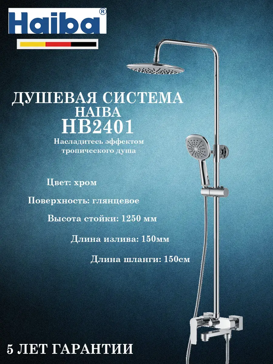 Душевая система Haiba HB2401 разработана по последним технологиям и имеет современный и стильный дизайн, выполнена в хромированном цвете. Фирменный керамический картридж обеспечивает плавность хода джойстика, качество смешивания воды и надежность запорного механизма. Предусмотрена регулировка тропического душа по высоте, также регулируется наклон верхнего душа. Максимальная высота стойки 1250 мм. Держатель ручной лейки регулируется по высоте. Комплект состоит из верхнего душа, лейки, шланги, штанги, смесителя, держателя лейки, крепления и эксцентриков. Гарантия 5 лет на корпус, 1 год на комплектующие, имеется выездной сервисный центр по всей России.