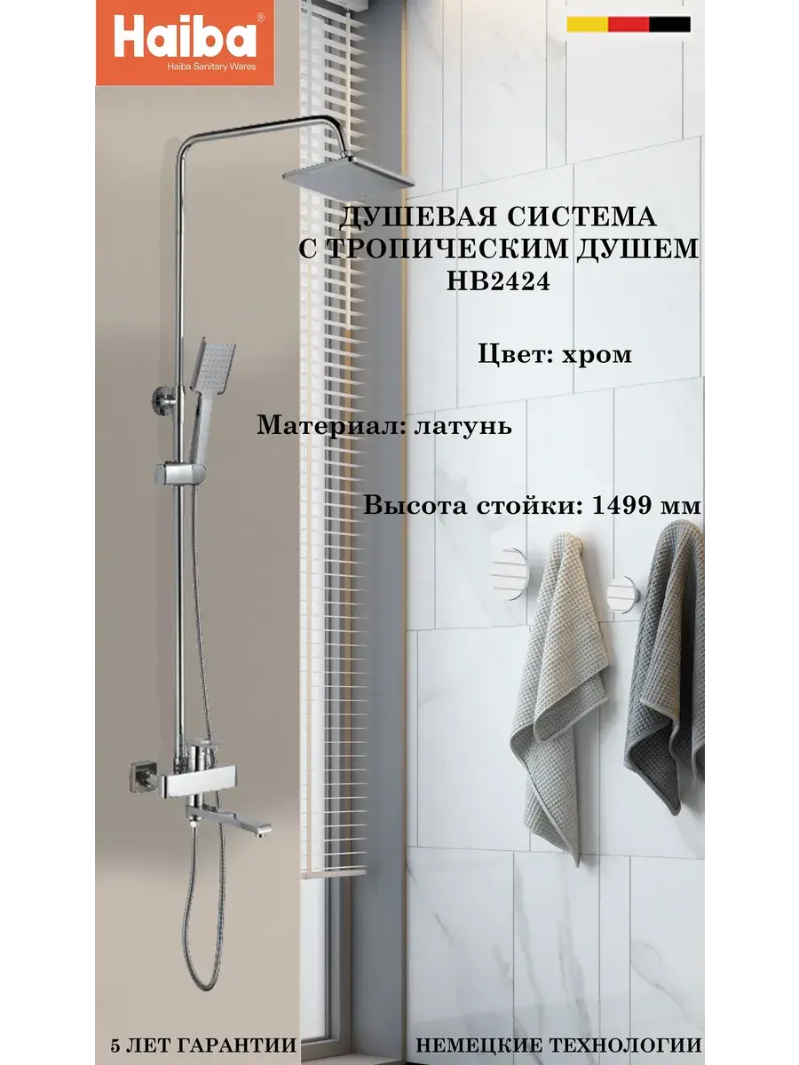 Душевая система Haiba HB2424 разработана по последним технологиям и имеет современный и стильный дизайн, выполнена в хромированном цвете. Фирменный керамический картридж обеспечивает плавность хода джойстика, качество смешивания воды и надежность запорного механизма. Предусмотрена регулировка тропического душа по высоте, также регулируется наклон верхнего душа. Максимальная высота стойки 1499 мм. Держатель ручной лейки регулируется по высоте. Комплект состоит из верхнего душа, лейки, шланги, штанги, смесителя, держателя лейки, крепления и эксцентриков. Гарантия 5 лет на корпус, 1 год на комплектующие, имеется выездной сервисный центр по всей России.