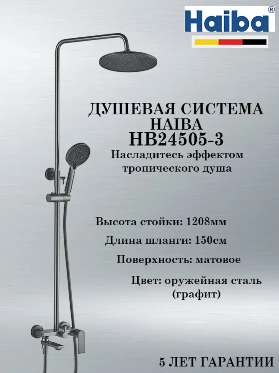 Душевая система Haiba HB24505-3 разработана по последним технологиям и имеет современный и стильный дизайн, выполнена в графитовом (оружейная сталь) цвете. Фирменный керамический картридж обеспечивает плавность хода джойстика, качество смешивания воды и надежность запорного механизма. Предусмотрена регулировка тропического душа по высоте, также регулируется наклон верхнего душа. Максимальная высота стойки 1208 мм. Держатель ручной лейки регулируется по высоте. Комплект состоит из верхнего душа, лейки, шланги, штанги, смесителя, держателя лейки, крепления и эксцентриков. Гарантия 5 лет на корпус, 1 год на комплектующие, имеется выездной сервисный центр по всей России.