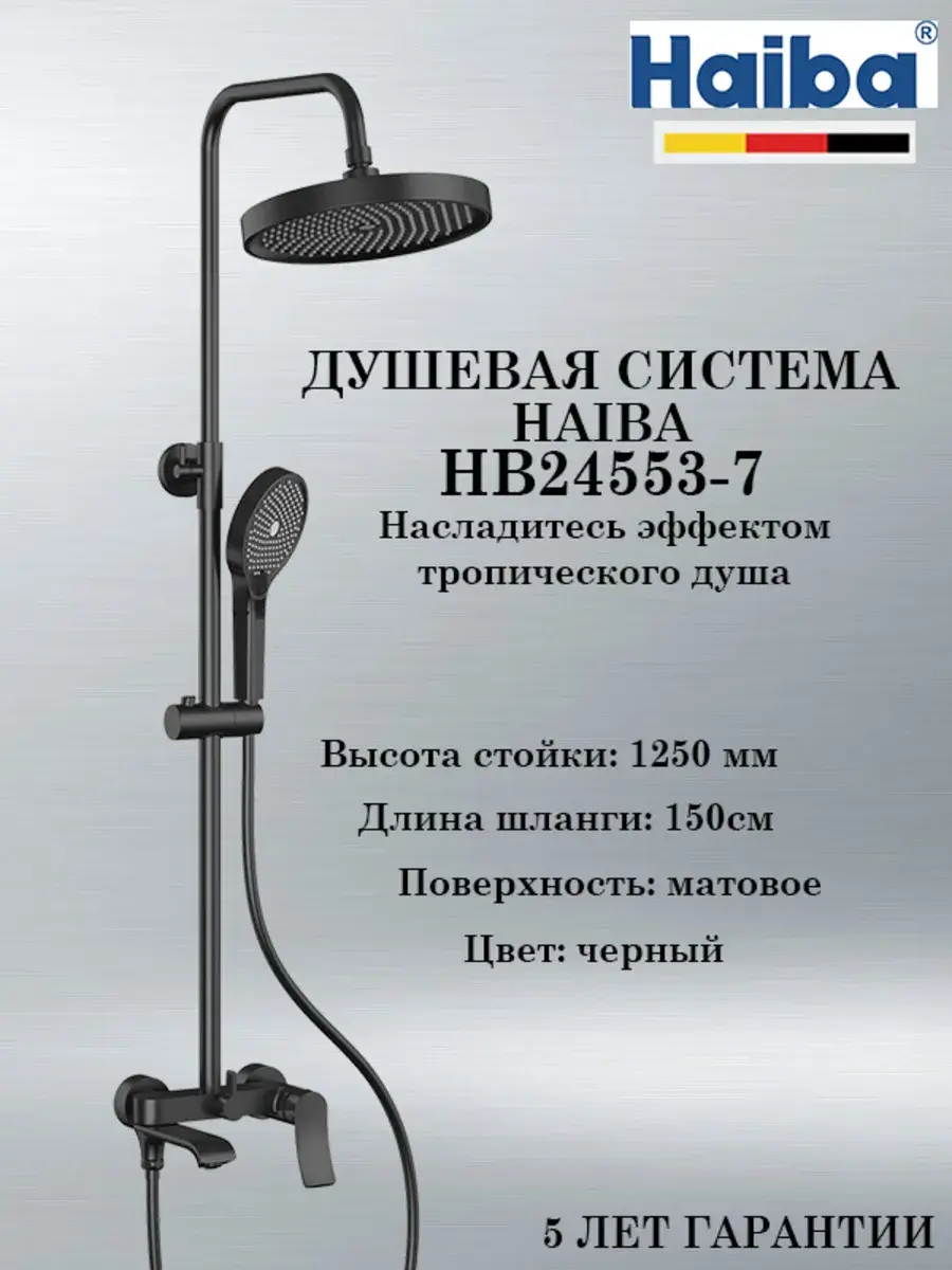 Душевая система Haiba HB24553-7 разработана по последним технологиям и имеет современный и стильный дизайн, выполнена в черном цвете. Фирменный керамический картридж обеспечивает плавность хода джойстика, качество смешивания воды и надежность запорного механизма. Предусмотрена регулировка тропического душа по высоте, также регулируется наклон верхнего душа. Максимальная высота стойки 1250 мм. Держатель ручной лейки регулируется по высоте. Комплект состоит из верхнего душа, лейки, шланги, штанги, смесителя, держателя лейки, крепления и эксцентриков. Гарантия 5 лет на корпус, 1 год на комплектующие, имеется выездной сервисный центр по всей России.