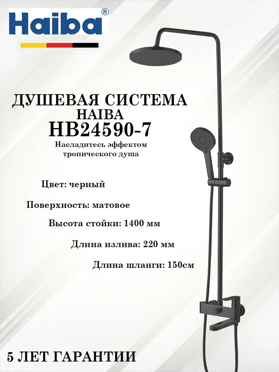 Душевая система Haiba HB24590-7 разработана по последним технологиям и имеет современный и стильный дизайн, выполнена в черном цвете. Фирменный керамический картридж обеспечивает плавность хода джойстика, качество смешивания воды и надежность запорного механизма. Предусмотрена регулировка тропического душа по высоте, также регулируется наклон верхнего душа. Максимальная высота стойки 1400 мм. Держатель ручной лейки регулируется по высоте. Комплект состоит из верхнего душа, лейки, шланги, штанги, смесителя, держателя лейки, крепления и эксцентриков. Гарантия 5 лет на корпус, 1 год на комплектующие, имеется выездной сервисный центр по всей России.
